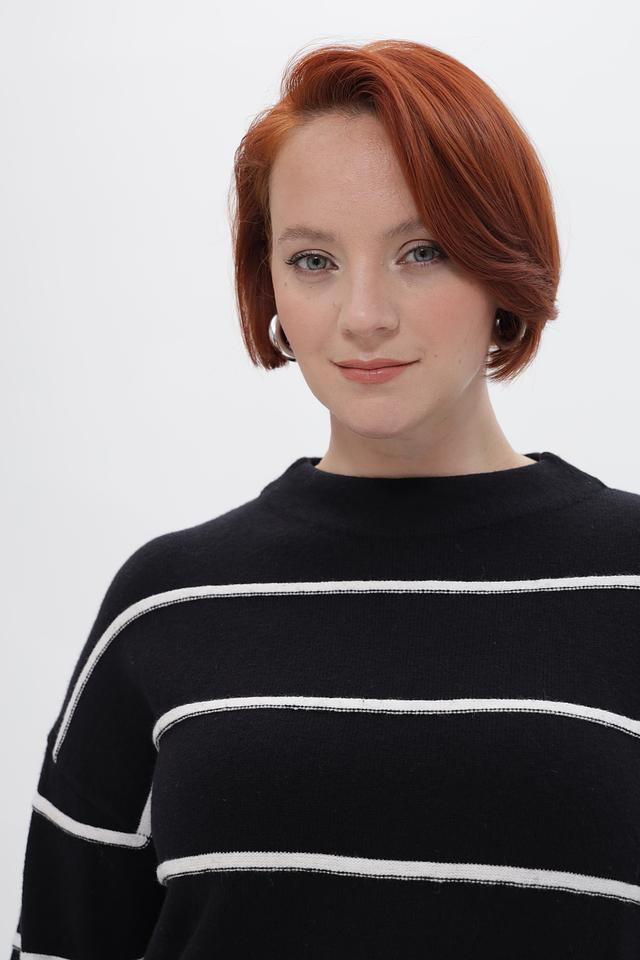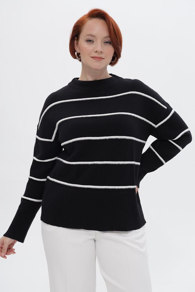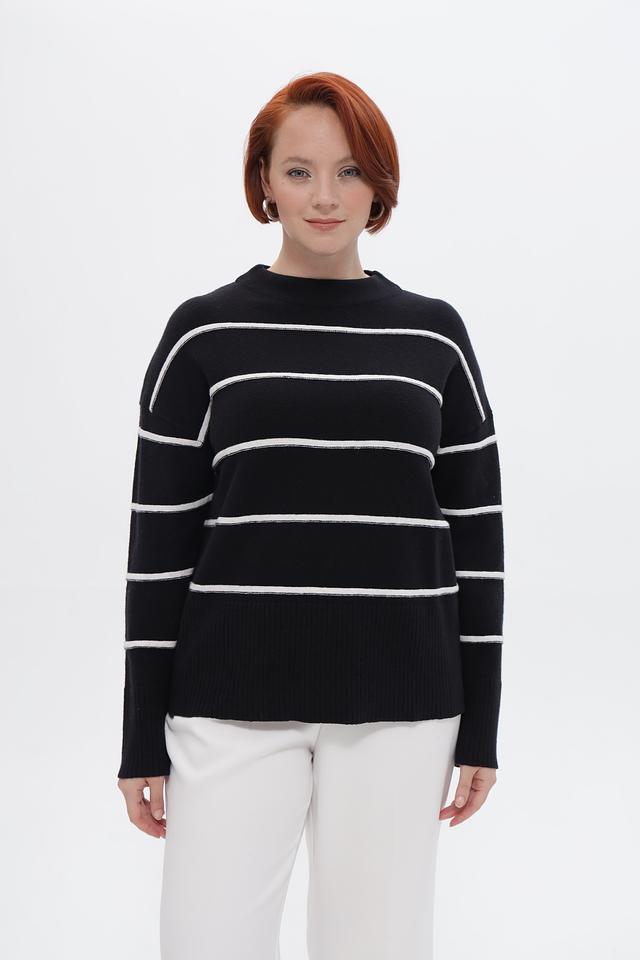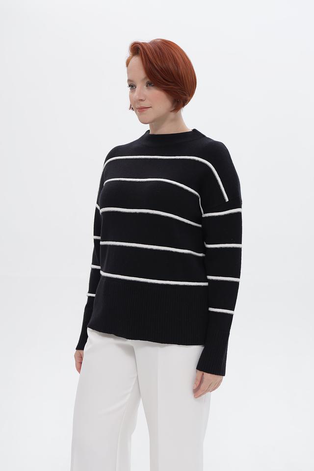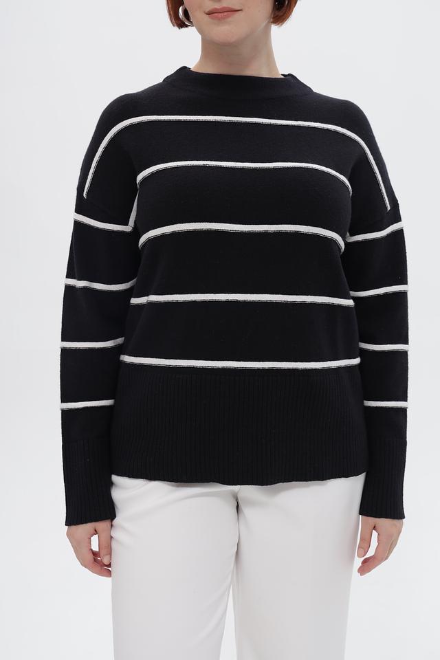 Пуловер украшен горизонтальными полосами белого цвета, что придает ему свежий и современный вид. Свободный крой обеспечивает комфортную посадку по фигуре и не сковывает движений.