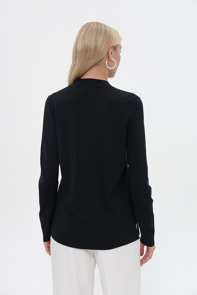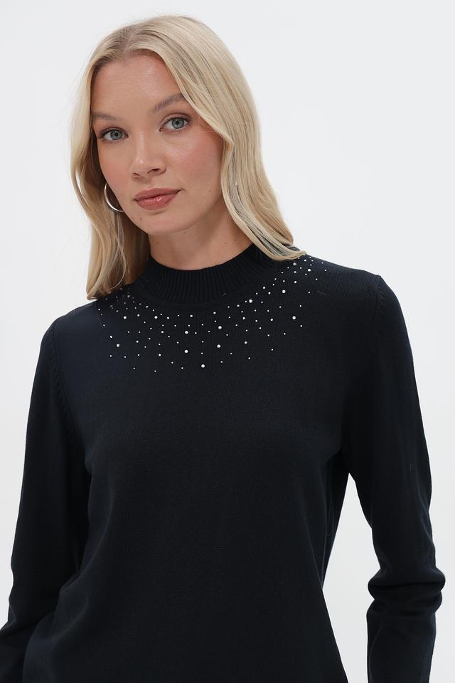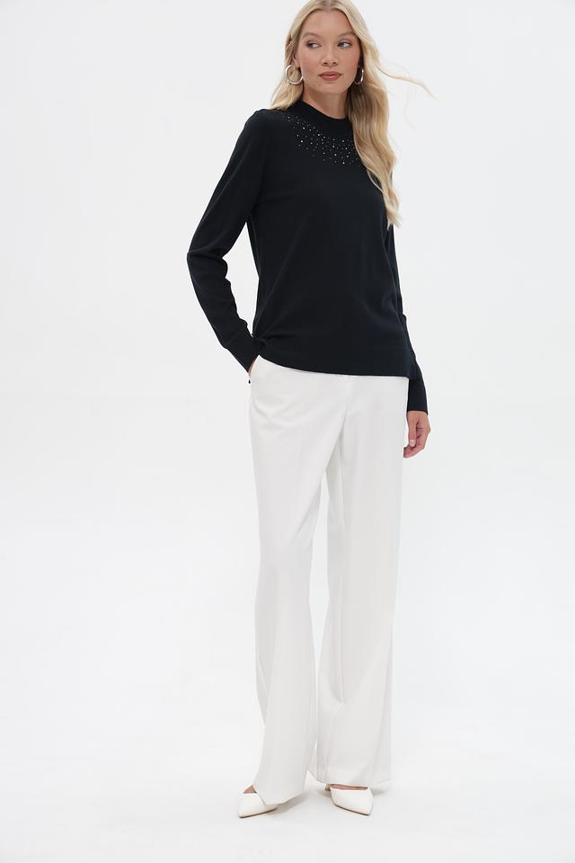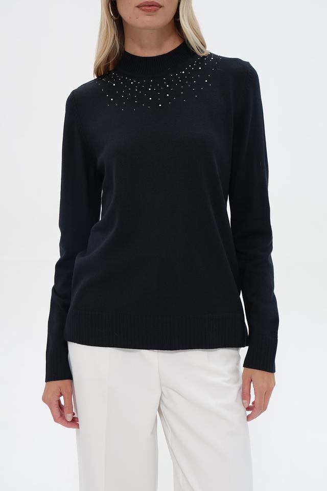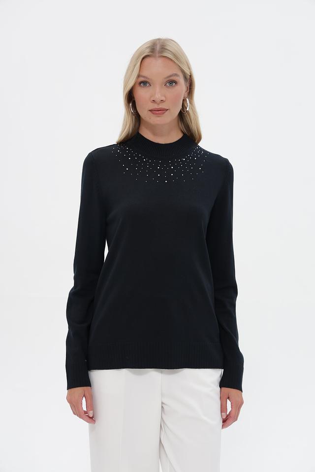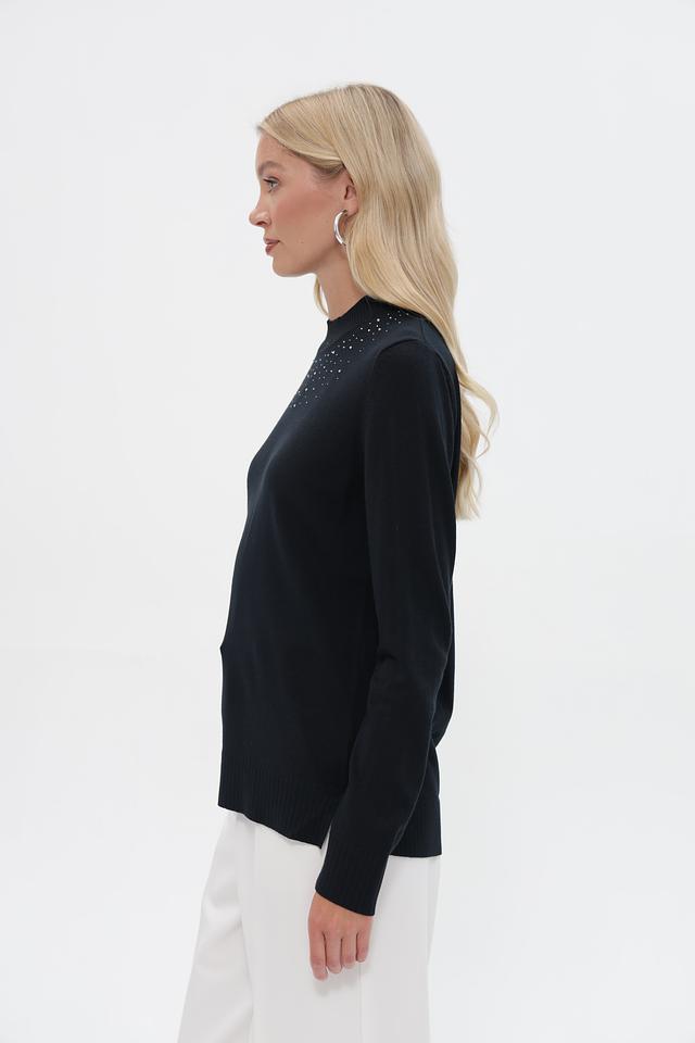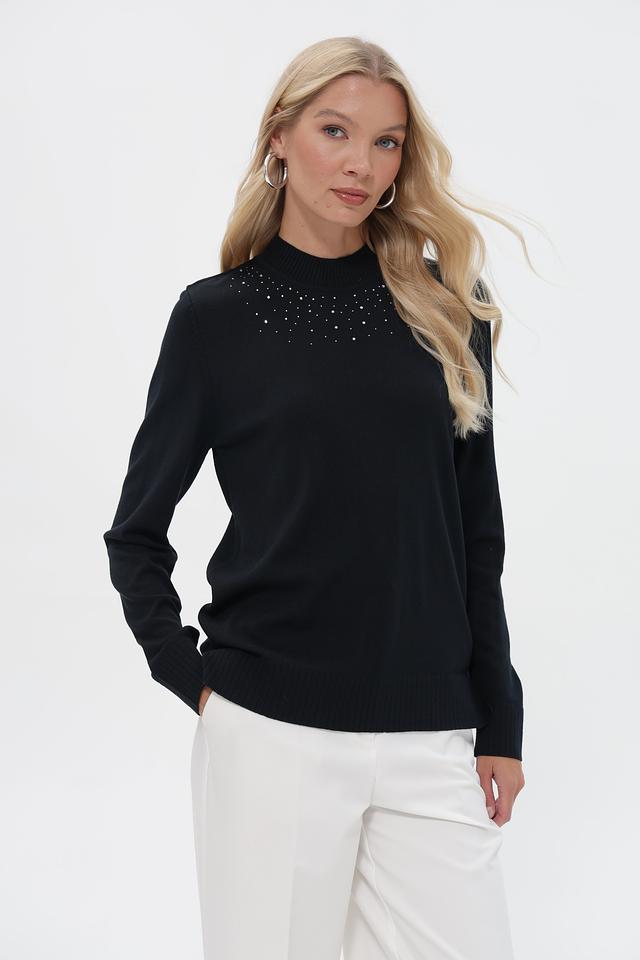 Пуловер имеет прямой, слегка свободный крой, который обеспечит комфортную посадку по фигуре. Высокий воротник-стойка декорирован рядами мелких светлых бусин, что придает изделию особую изысканность.