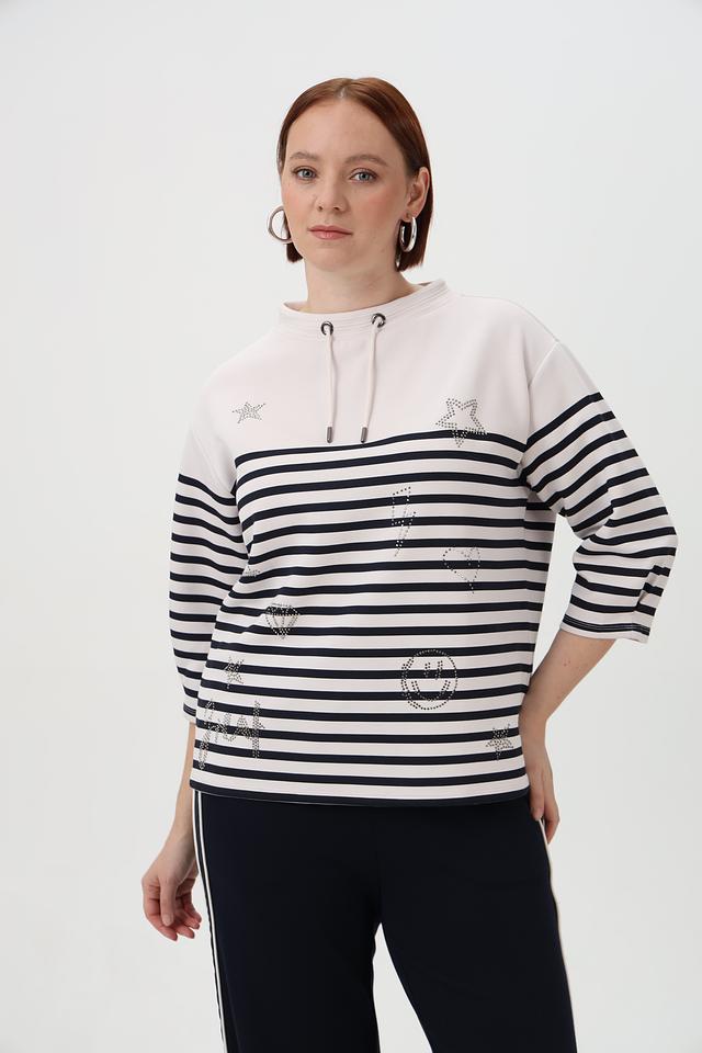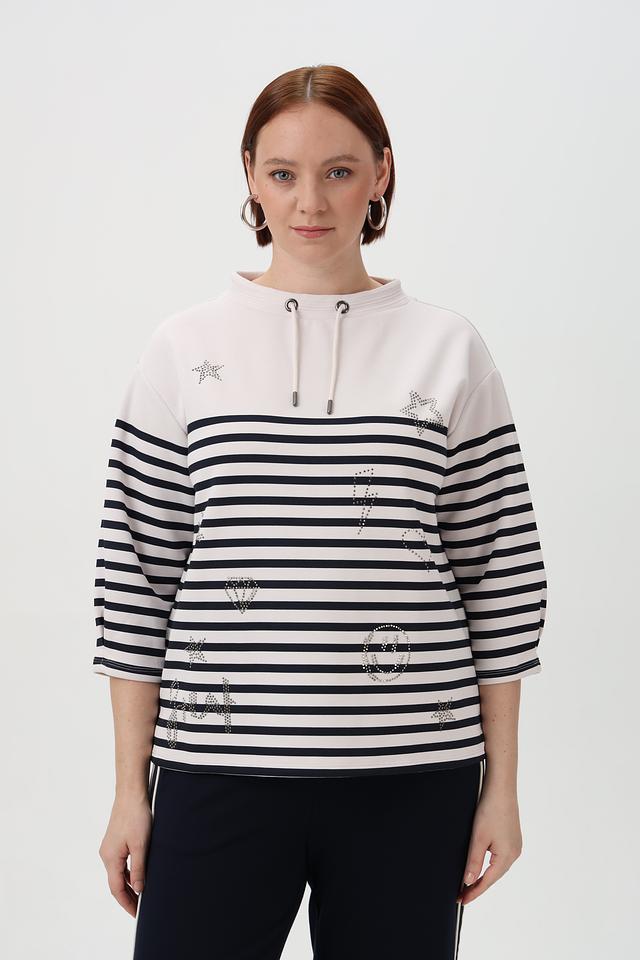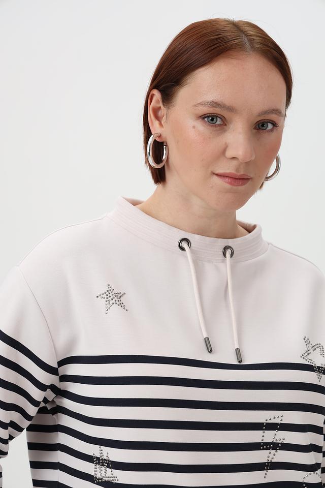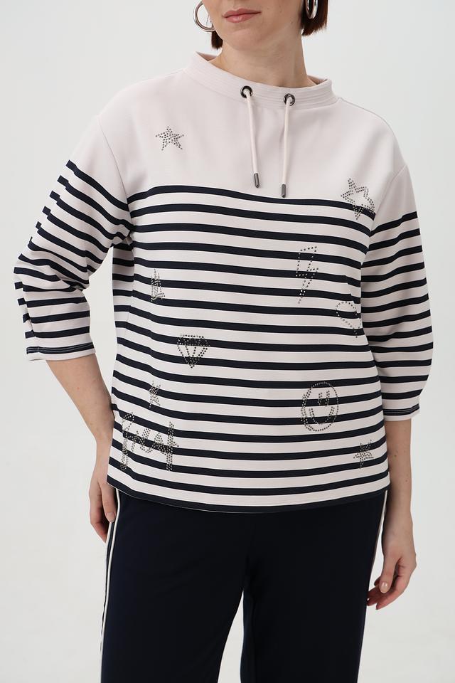 Этот пуловер от Barbara Lebek – идеальный выбор для тех, кто ценит комфорт и стиль. Выполнен в классической бело-синей полоску, украшен аппликациями в виде звезд, молний и смайликов, инкрустированными стразами. Модель имеет удобный круглый вырез горловины, дополненный шнурками на капюшоне.