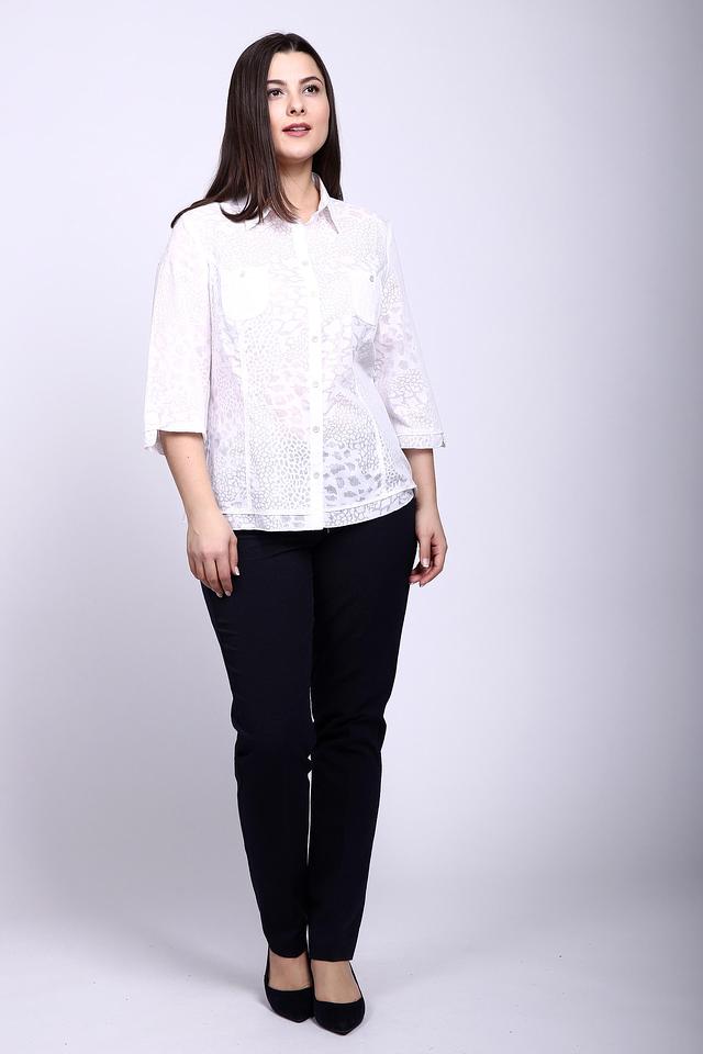 Блуза имеет классический крой с воротником и застежкой на пуговицы. Рукава длиной 3/4 делают ее универсальной для любого времени года. Сочетание полиэстера и хлопка в составе обеспечивает комфорт и практичность в уходе.