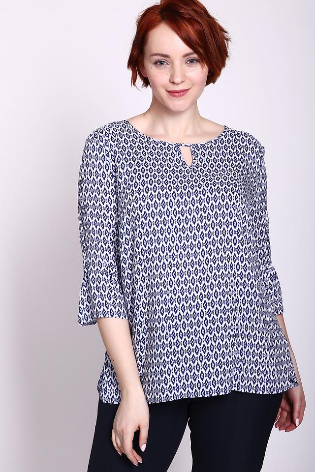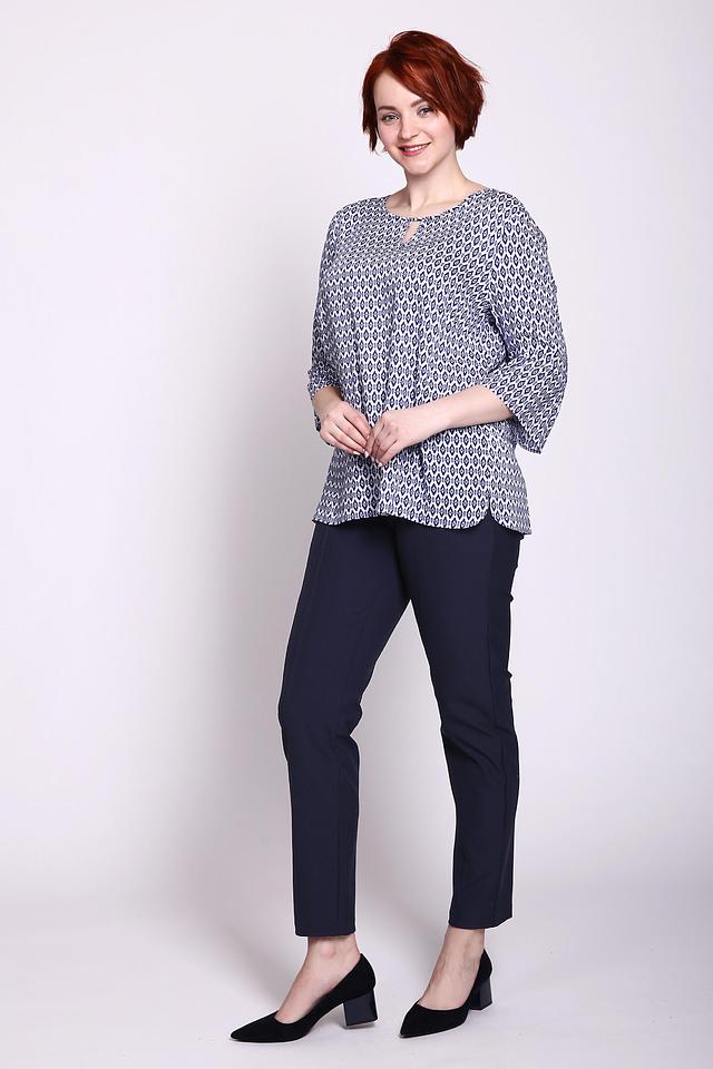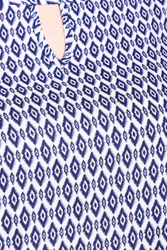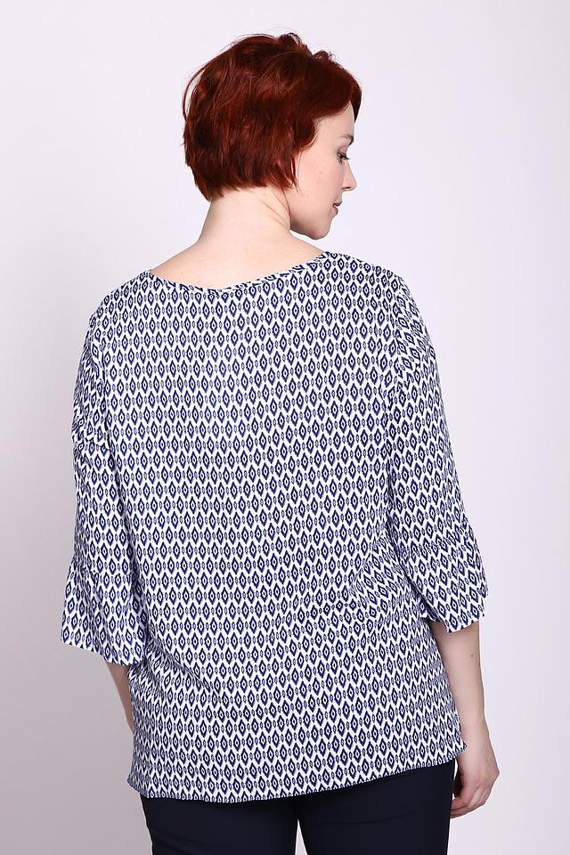 Основной цвет блузы – белый, но её главным украшением является яркий геометрический принт в синих тонах. Принт состоит из ромбов и других фигур, которые создают динамичный и современный вид. Вырез горловины оформлен небольшим V-образным разрезом, что добавляет образу женственности.