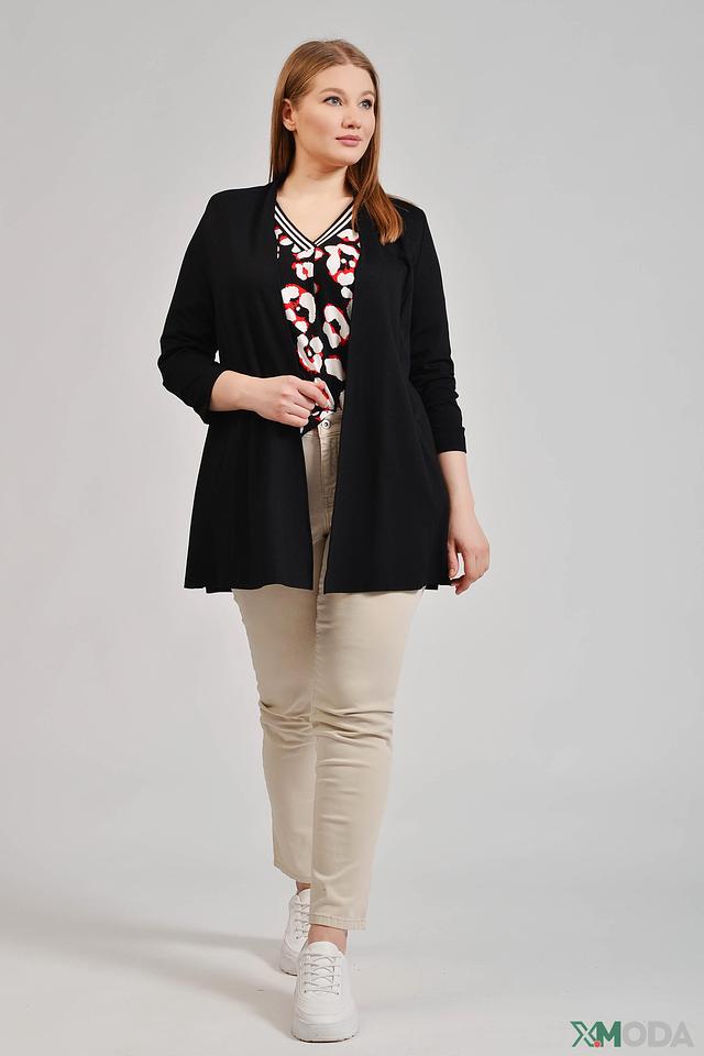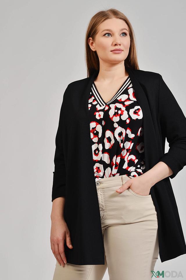 Модель выполнена из качественной вискозы, полиамида и эластана, благодаря чему она приятна к телу, хорошо держит форму и не мнется. Отсутствие застежки делает жакет легким и удобным в носке. Рукава 3/4 добавляют образу изящества.