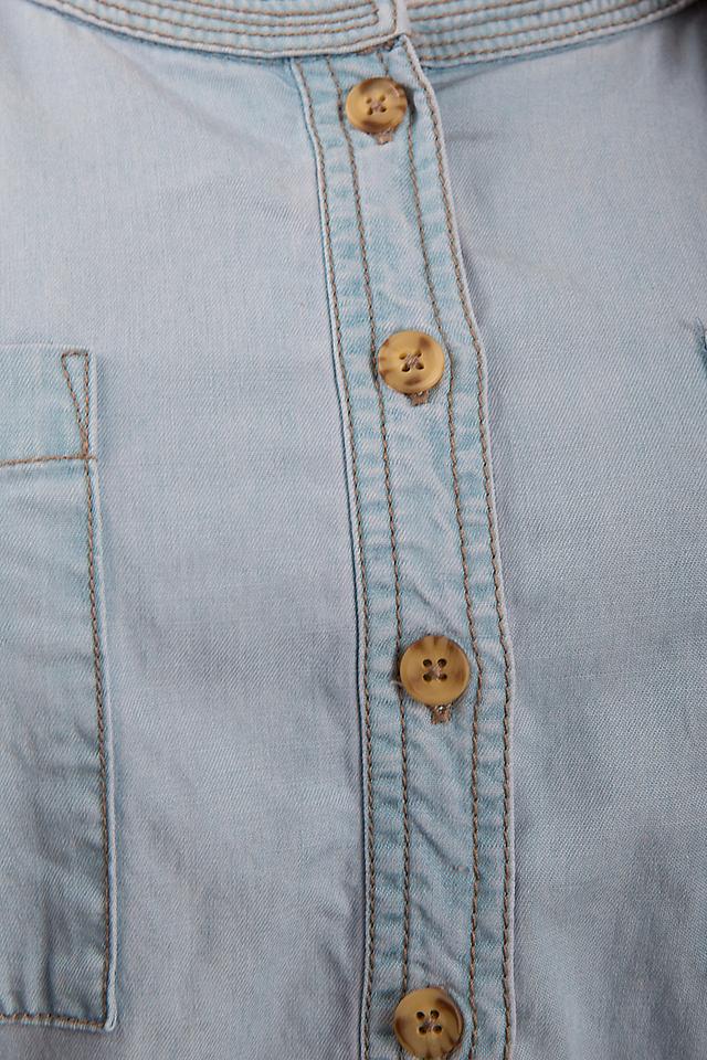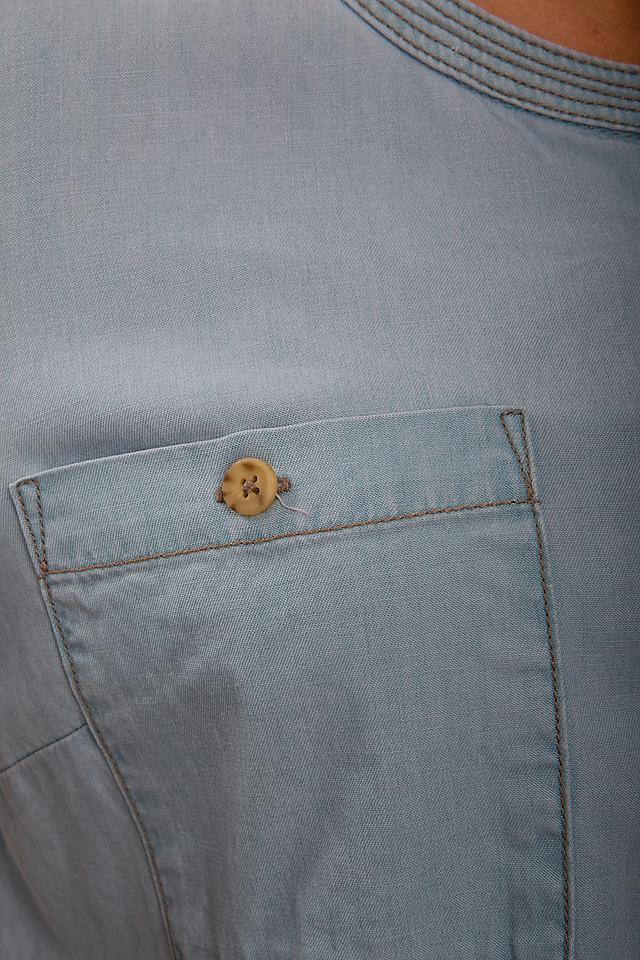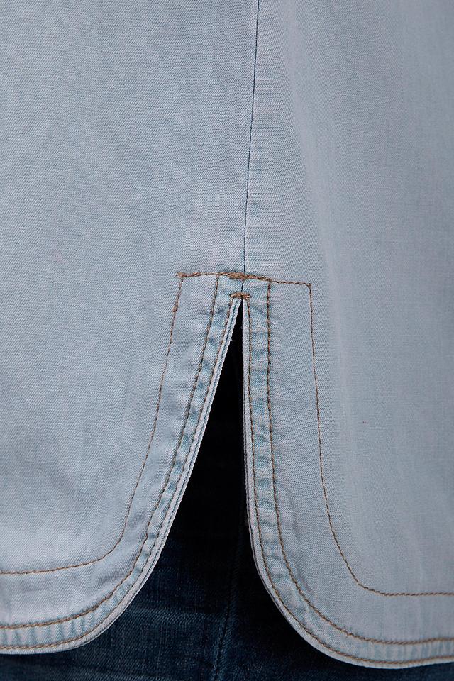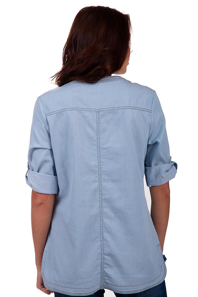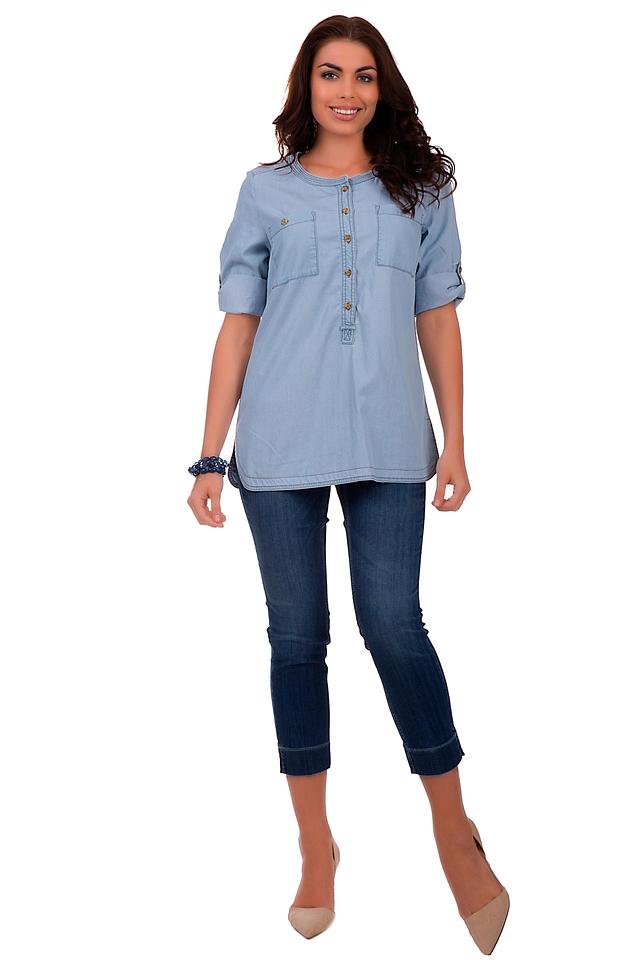 Блуза имеет голубой цвет, имитирующий джинсовую ткань. Передняя часть украшена аккуратной планкой с пуговицами, а также двумя накладными карманами. Рукава 3/4 с возможностью регулировки длины благодаря манжетам на пуговицах.