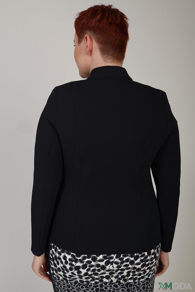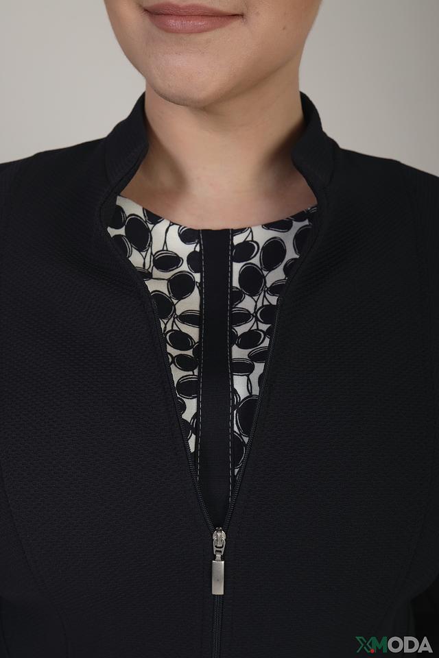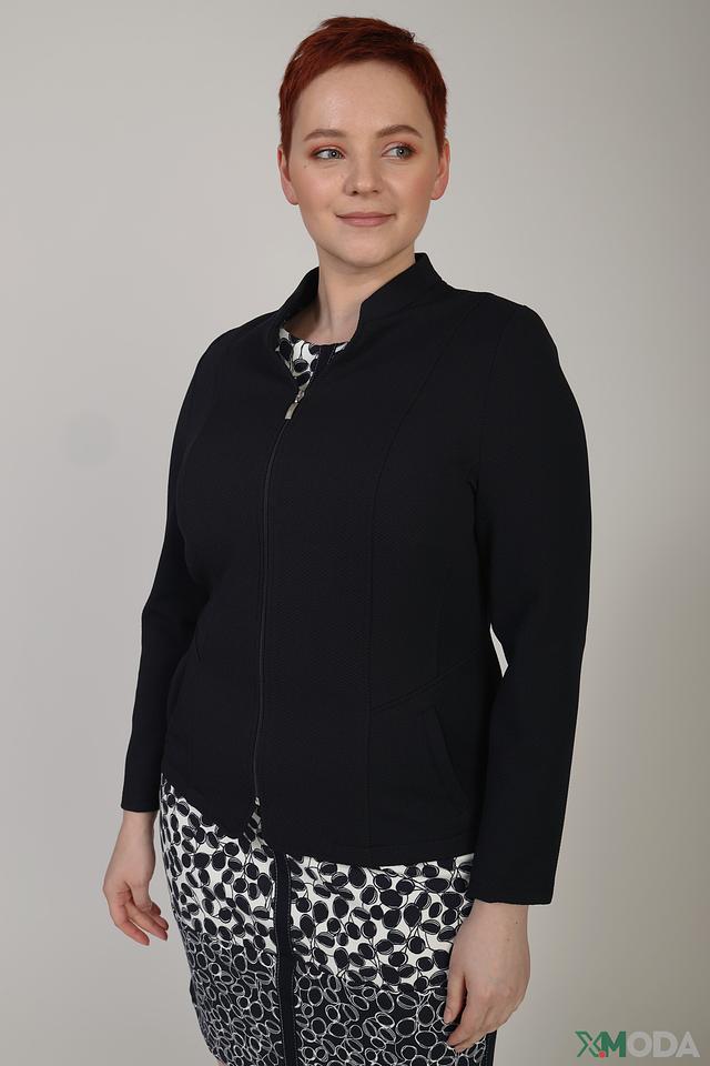 Жакет имеет классический крой с длинными рукавами и застёжкой на молнию. Текстурированная поверхность ткани придает изделию особый шарм. Удобный воротник-стойка добавляет образу строгости и элегантности.