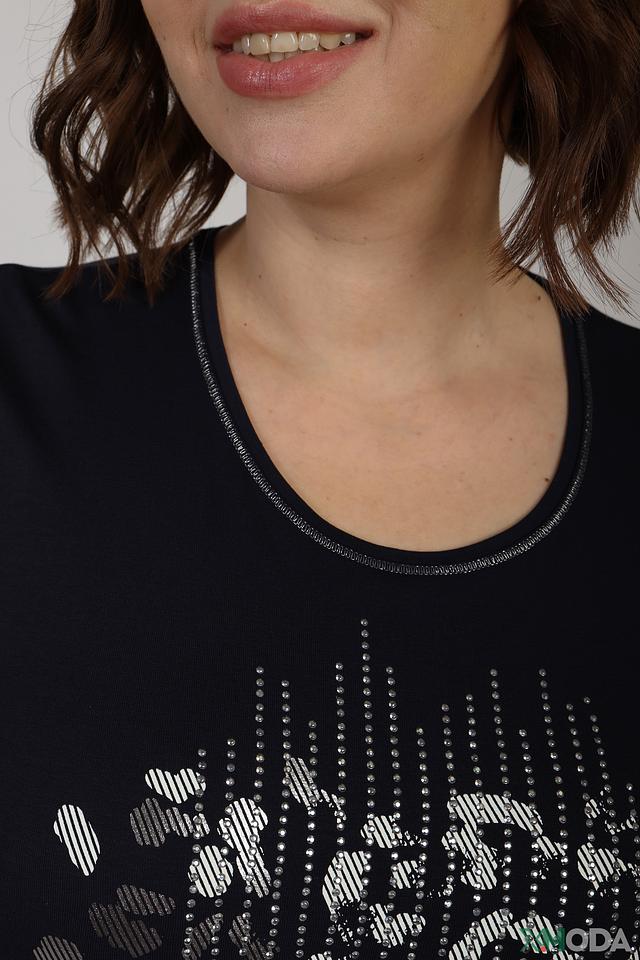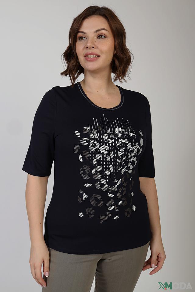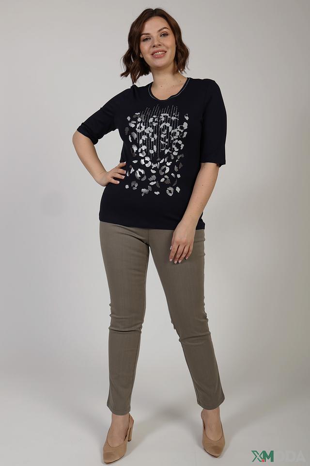 Особенностью данной модели является оригинальный декор из страз, выполненный в виде леопардового принта. Этот акцент придает футболке изысканность и привлекательность. Вырез горловины и рукава аккуратно обработаны, что обеспечивает комфорт при носке.