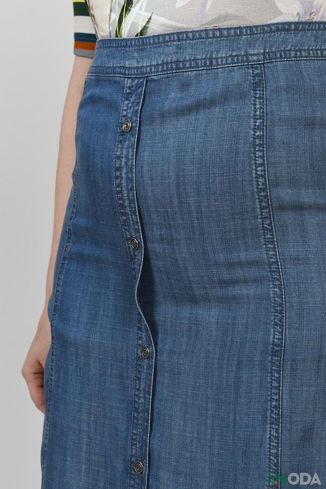 Юбка имеет длину миди и прямую посадку, что делает ее универсальной для разных типов фигур. Застежка на пуговицы по всей длине юбки позволяет регулировать степень облегания и создавать различные образы.