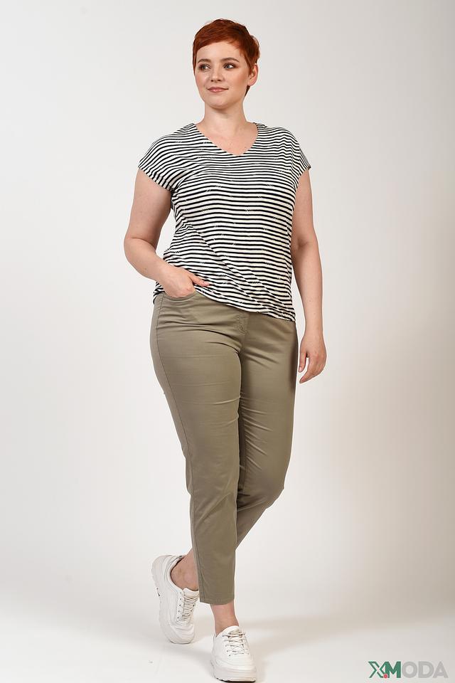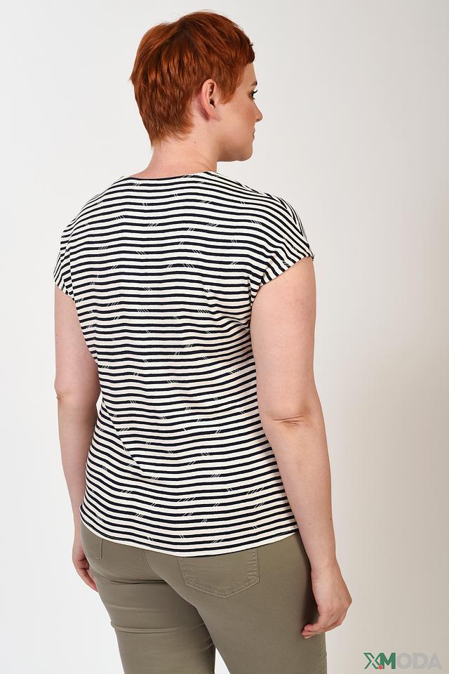 Топ имеет классический крой с короткими рукавами и V-образным вырезом, который визуально удлиняет шею и делает силуэт более изящным. Чёрно-белая полоска добавляет образу динамичности и универсальности.