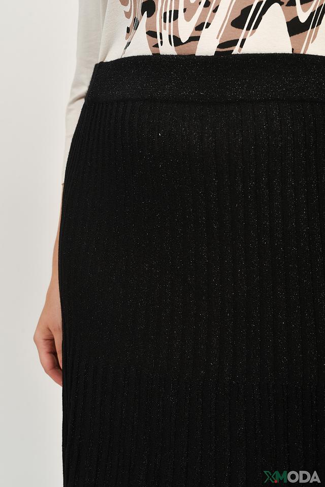 Юбка имеет миди длину и выполнена из текстурированной ткани с мелким плиссе, что придает ей изысканный вид. Плиссировка обеспечивает легкую драпировку и свободу движений.