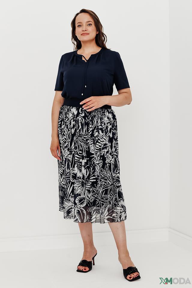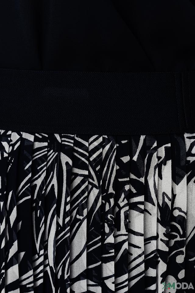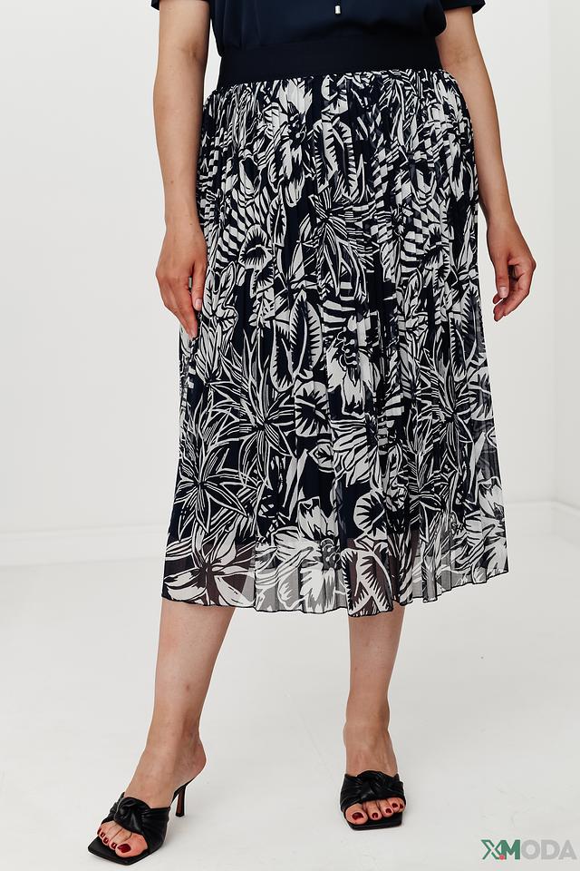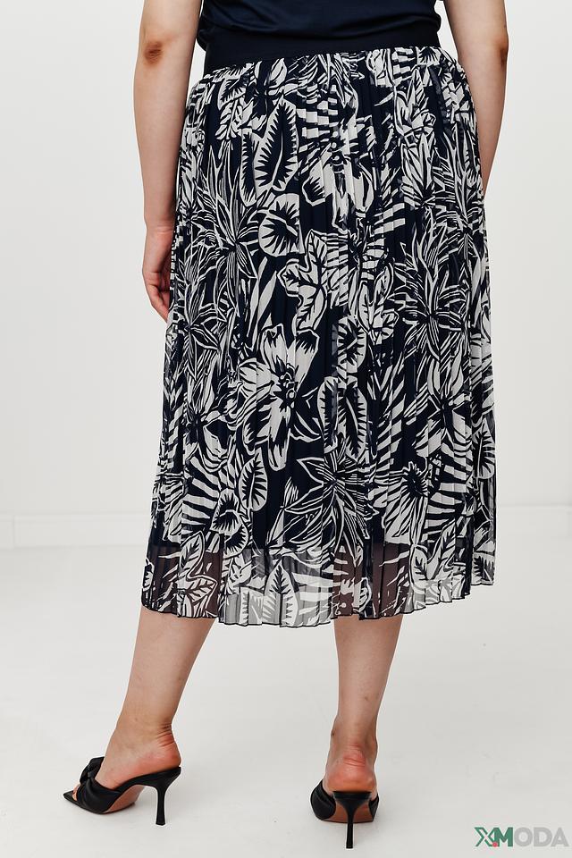 Юбка имеет длину миди и свободный крой, который не сковывает движений. Эластичный пояс обеспечивает надежную посадку по фигуре. Главная особенность этой юбки – эффектный принт с изображением тропических листьев в белых и черных тонах.