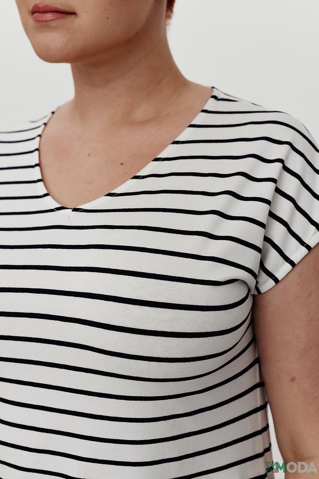 Модель имеет удобный V-образный вырез, который визуально удлиняет шею и делает силуэт более изящным. Короткие рукава обеспечивают комфорт в теплую погоду.