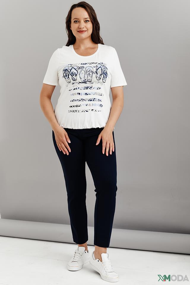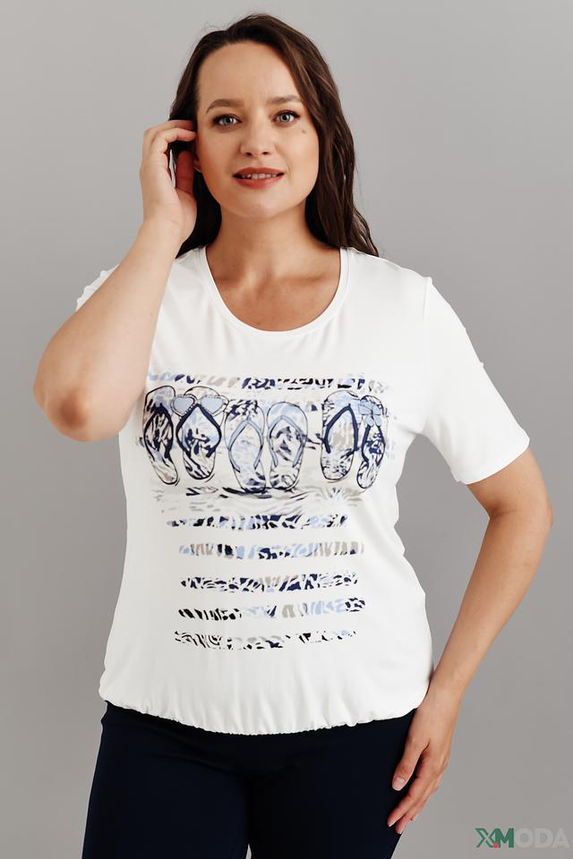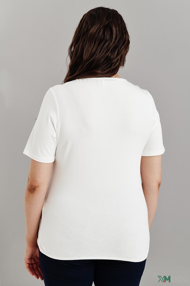 Модель имеет прямой крой и короткие рукава, что обеспечивает комфорт в жаркую погоду. Круглый вырез горловины подчеркивает женственность силуэта. Футболка изготовлена из высококачественной вискозы с добавлением эластана, благодаря чему она приятна к телу, хорошо драпируется и не мнется.