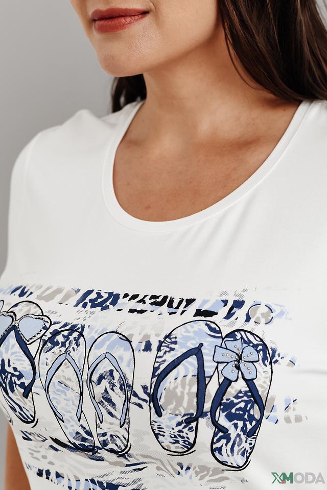 Белая футболка Lebek с оригинальным принтом тапочек станет отличным дополнением к вашему летнему гардеробу. Модель выполнена из мягкой вискозы с добавлением эластана, обеспечивая комфорт и свободу движений. Состав: вискоза 95%, эластан 5%