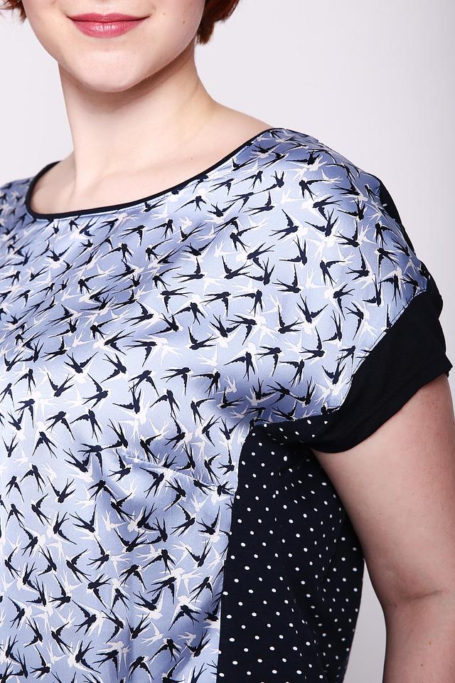 Сбоку блузы вставка из ткани в белый горошек. Эта деталь добавляет образу игривости и оригинальности. Блуза идеально подойдет для создания повседневных и вечерних образов. Ее можно сочетать с брюками, юбками или джинсами.
