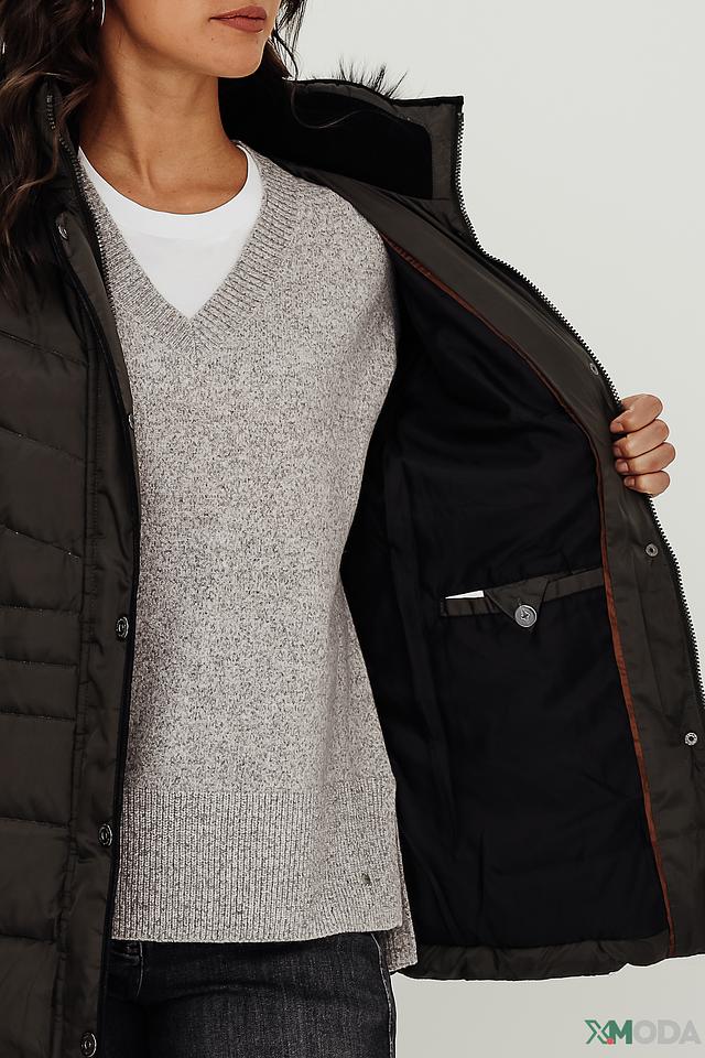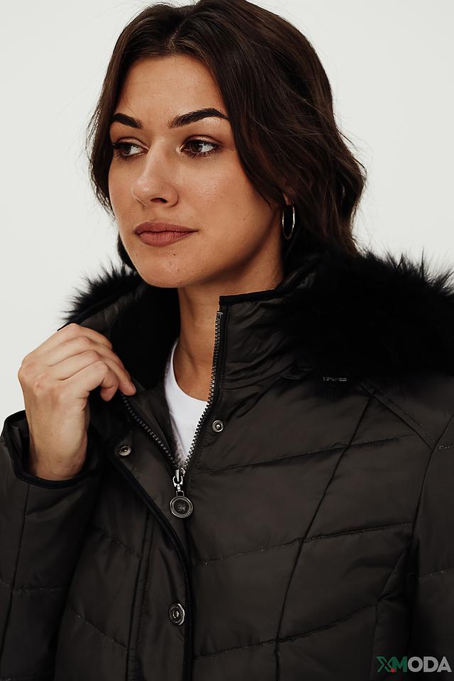 Особенности: стеганая текстура, капюшон с искусственным мехом, застежка на молнию и кнопки, удобные карманы.