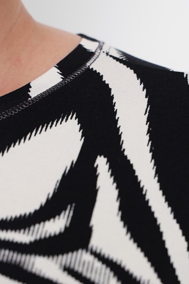 Основной цвет футболки – чёрный, украшенный ярким принтом в виде полос зебры. Принт выполнен в белом цвете, создавая контрастный и эффектный образ. Футболка имеет круглый вырез горловины и короткие рукава, что делает её идеальной для тёплой погоды.