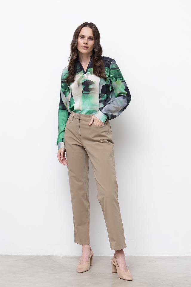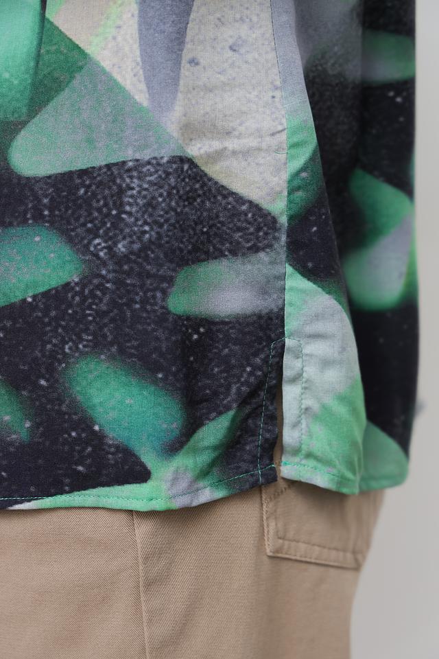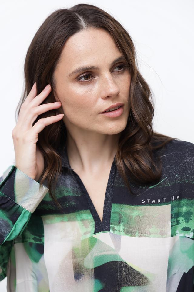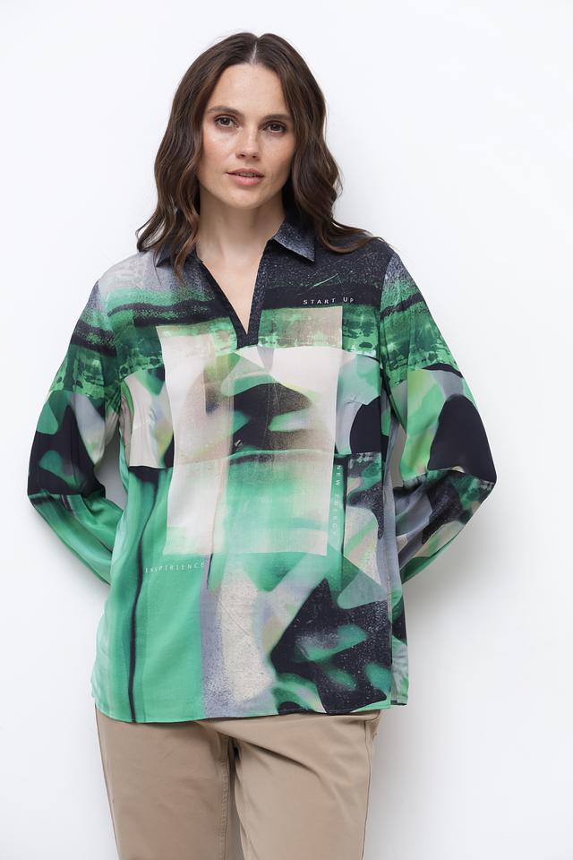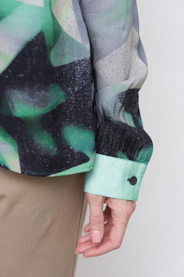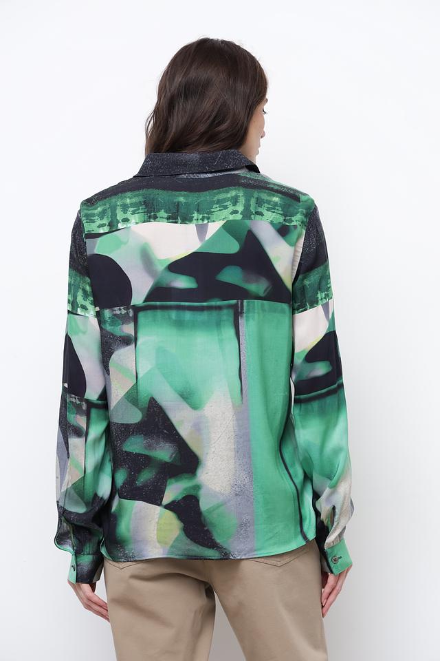 Блуза имеет свободный крой, длинные рукава и классический воротник. Главная особенность модели – яркий абстрактный принт, сочетающий в себе различные оттенки зеленого, черного и белого. Такой рисунок добавит образу оригинальности и индивидуальности.