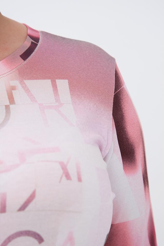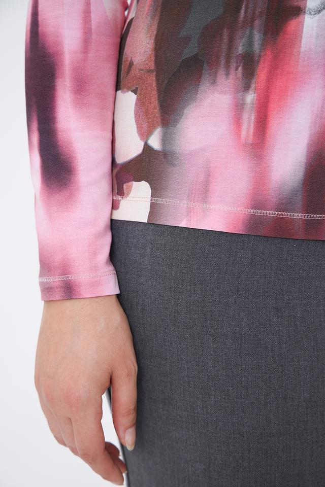 Особенностью данной модели является яркий абстрактный принт в нежно-розовой гамме с добавлением серых и белых оттенков. Принт создает эффект размытых мазков, придавая изделию художественный вид.