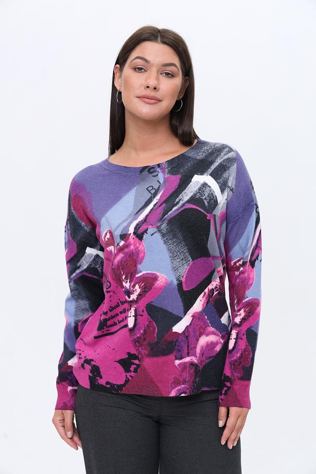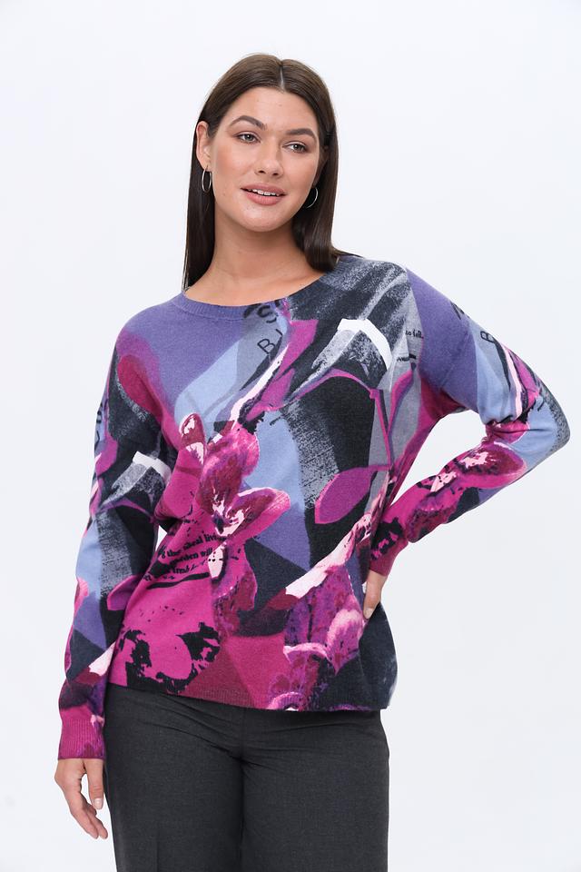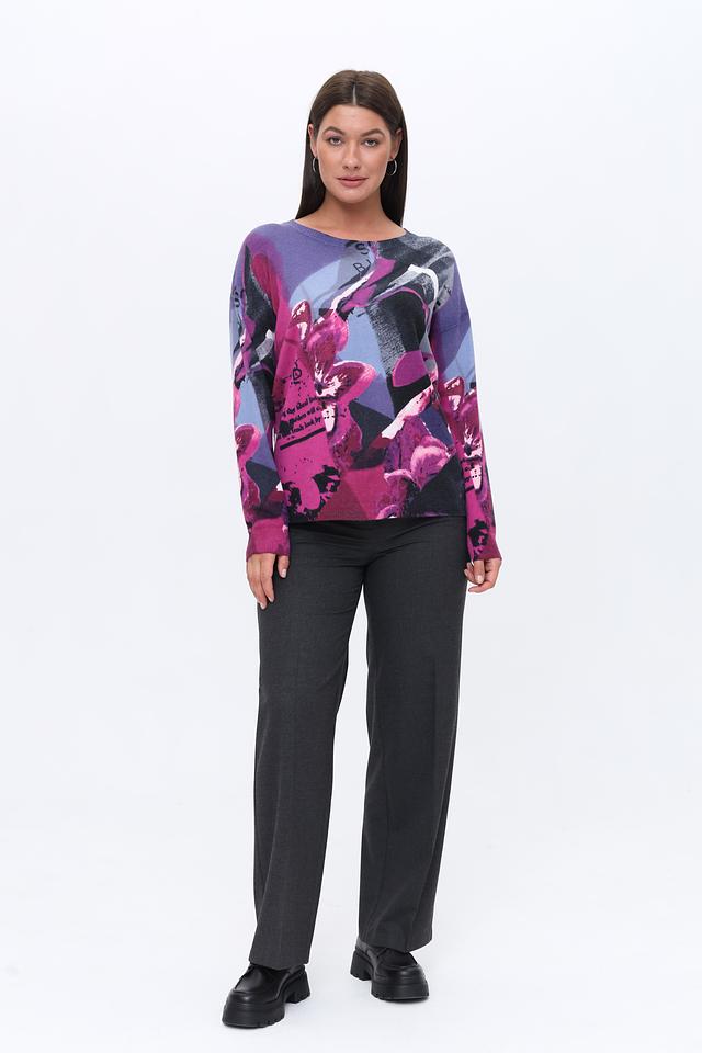 Пуловер имеет свободный крой и круглый вырез горловины. Его отличает оригинальный принт с изображением ярких цветов, выполненный в фиолетовой гамме с добавлением розовых, серых и белых оттенков. Такой рисунок делает этот пуловер уникальным и привлекательным.