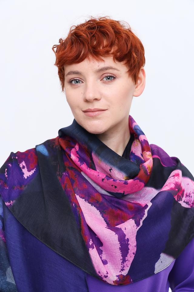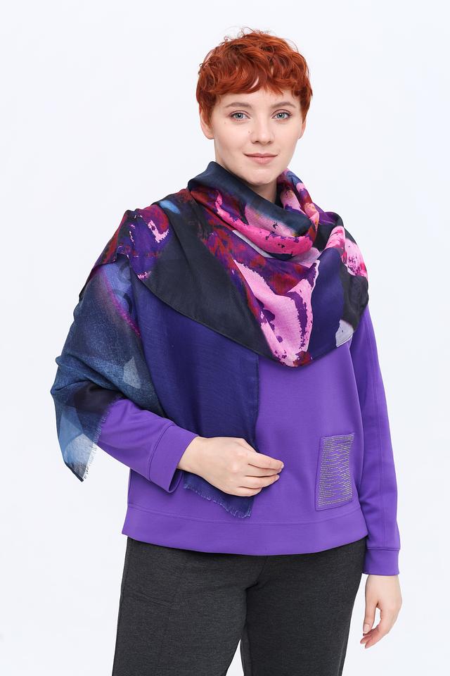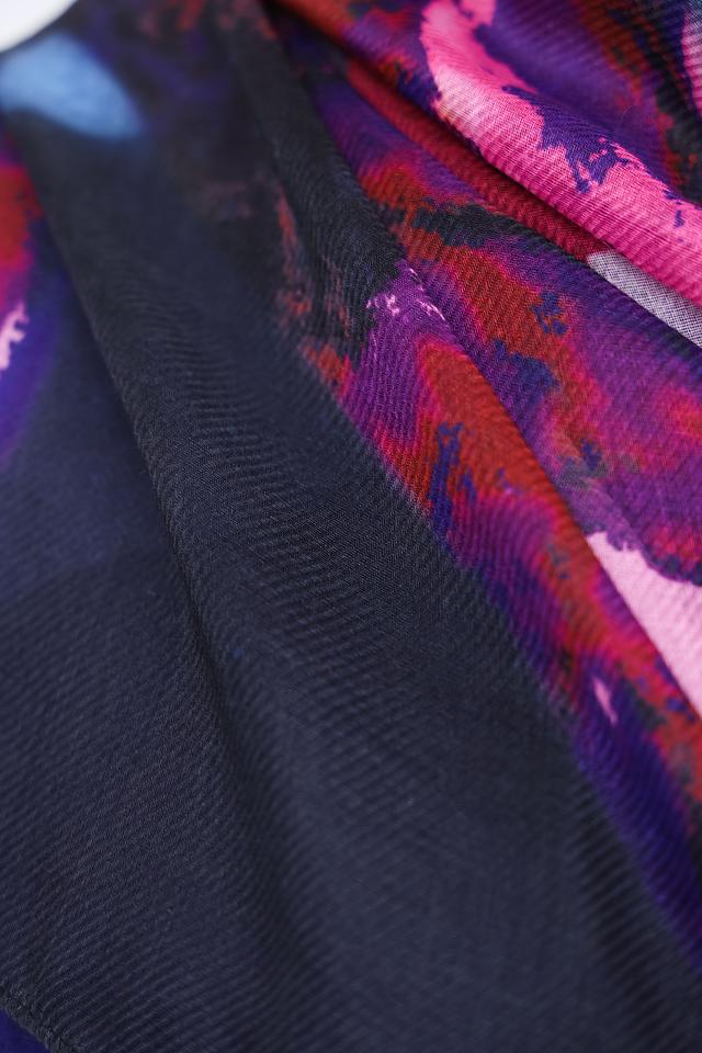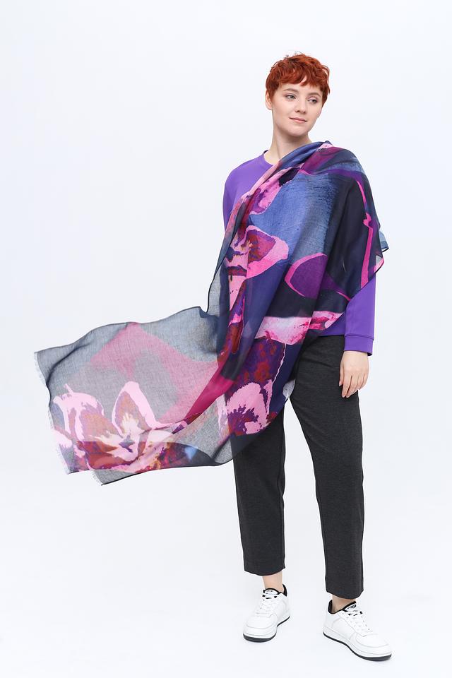 Основной цвет платка – глубокий фиолетовый, который служит прекрасным фоном для яркого и красочного цветочного принта. Комбинация розовых, пурпурных и синих оттенков создает эффектный визуальный образ.
