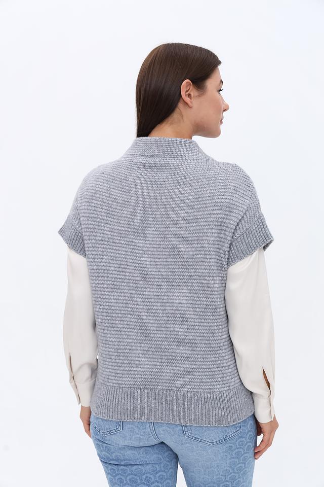 Жилет имеет прямой крой и удобную длину. Высокий воротник добавляет изысканности образу. Вязаная текстура придает изделию уютный и стильный вид.