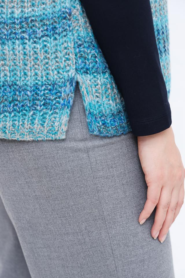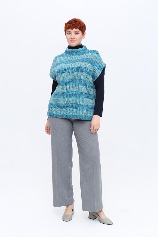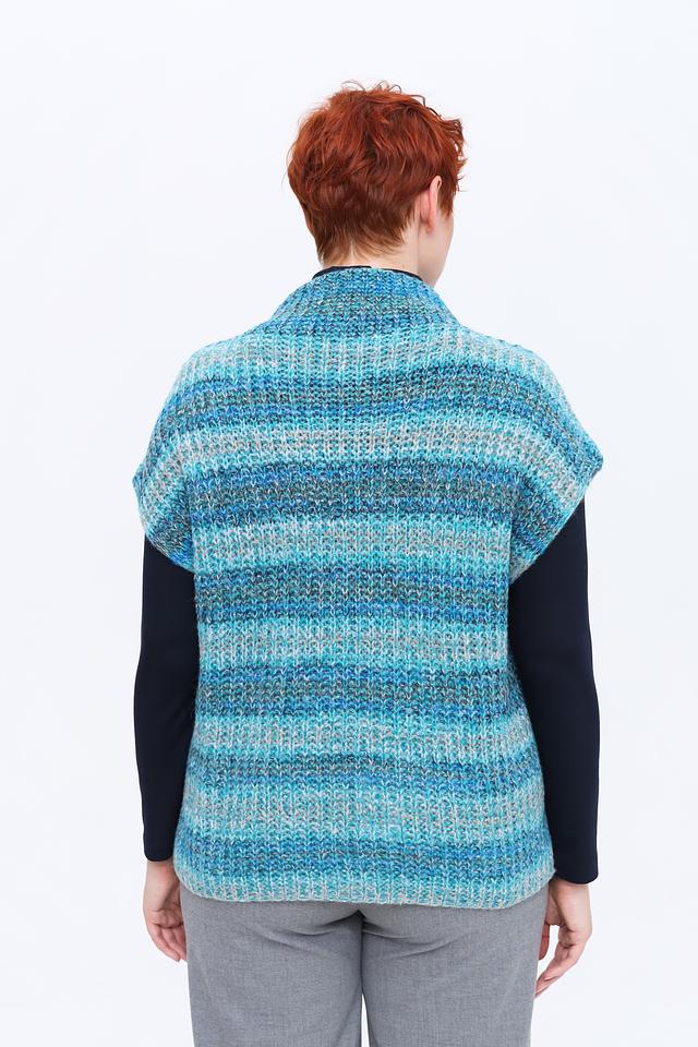 Жилет имеет полосатый дизайн в бирюзовых и серых тонах, что делает его универсальным и легко сочетаемым с различными элементами гардероба. Высокий воротник добавляет изысканности, а отсутствие рукавов обеспечивает свободу движений.