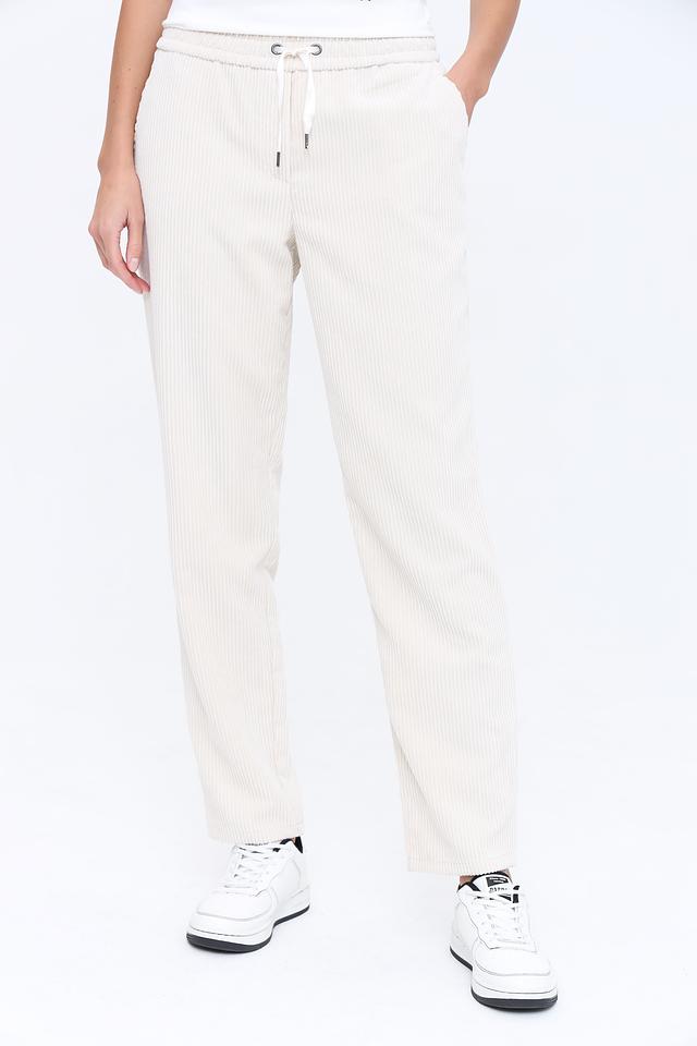 Брюки имеют прямой крой и стандартную посадку по талии. Застежка на молнию и пуговицу, а также шнурок на талии позволяют регулировать облегание. Модель дополнена боковыми карманами.