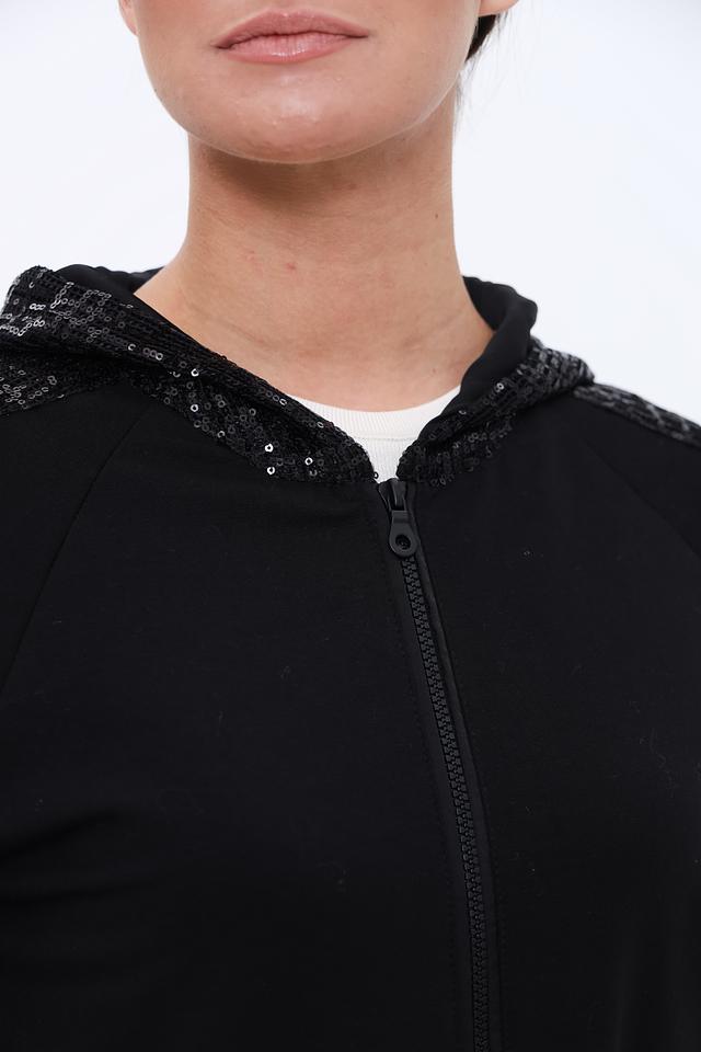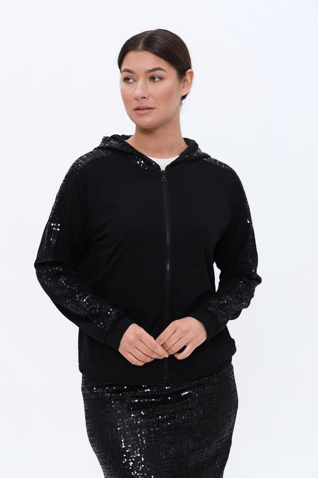 Чёрный жакет Lecomte с пайетками на рукавах – стильное и комфортное решение для создания модных образов. Модель на молнии с капюшоном, выполнена из мягкого трикотажа с добавлением хлопка и модала. Состав: хлопок 47%, модал 47%, эластан 6%