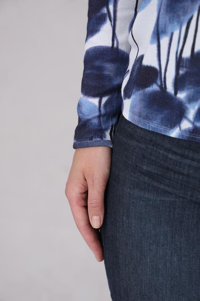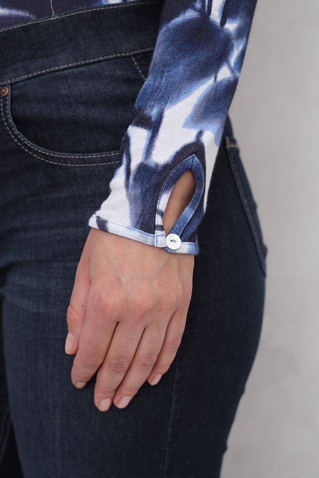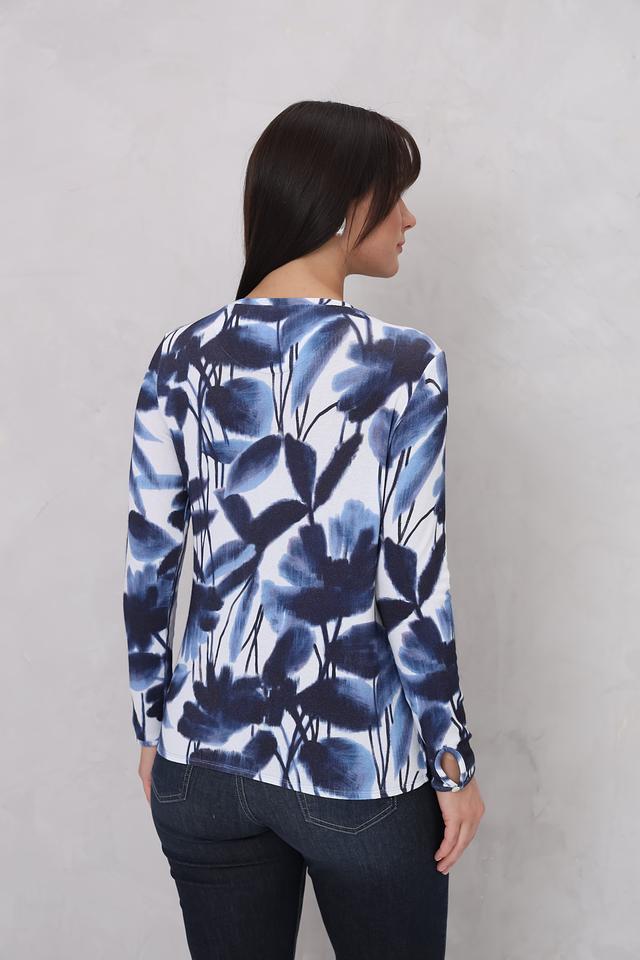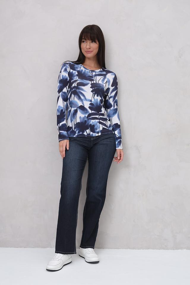 Основной цвет блузы – синий, но её украшает яркий и необычный цветочный принт, выполненный в технике акварели. Принт состоит из размытых синих и белых мазков, напоминающих абстрактные цветы и листья.