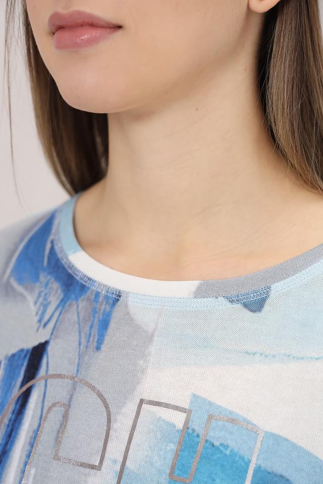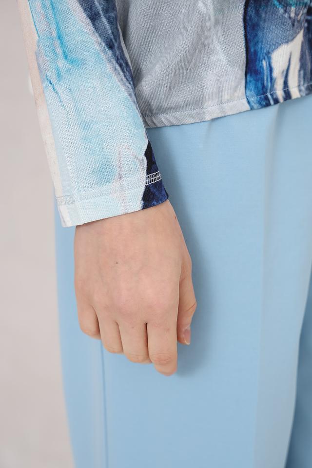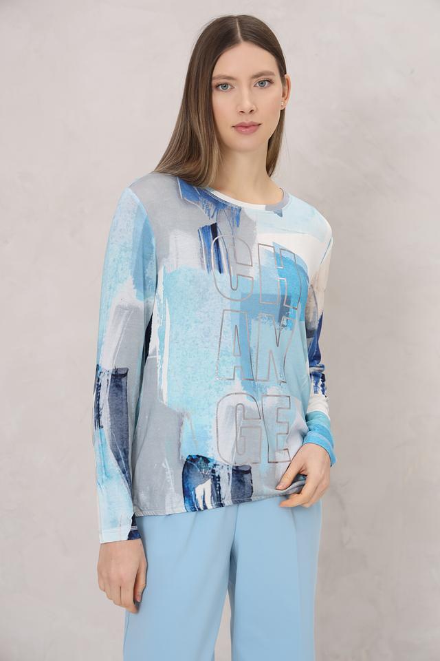 Пуловер имеет свободный крой и длинные рукава. Главная особенность модели – эффектный принт "Change Angel", выполненный в сочетании голубых, серых и белых оттенков, напоминающий мазки кисти художника.