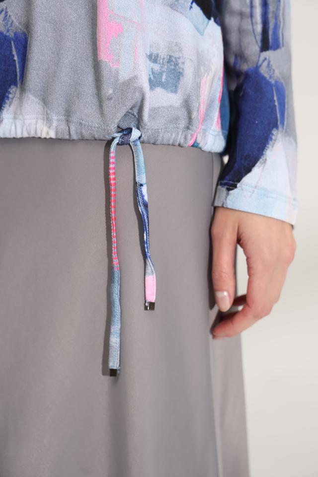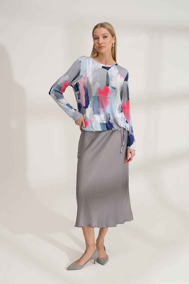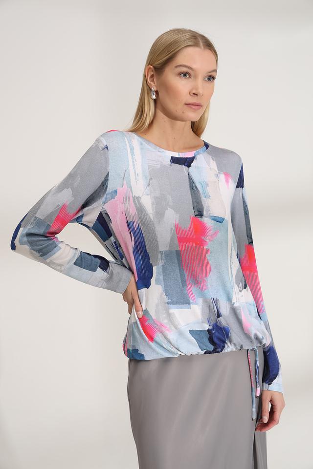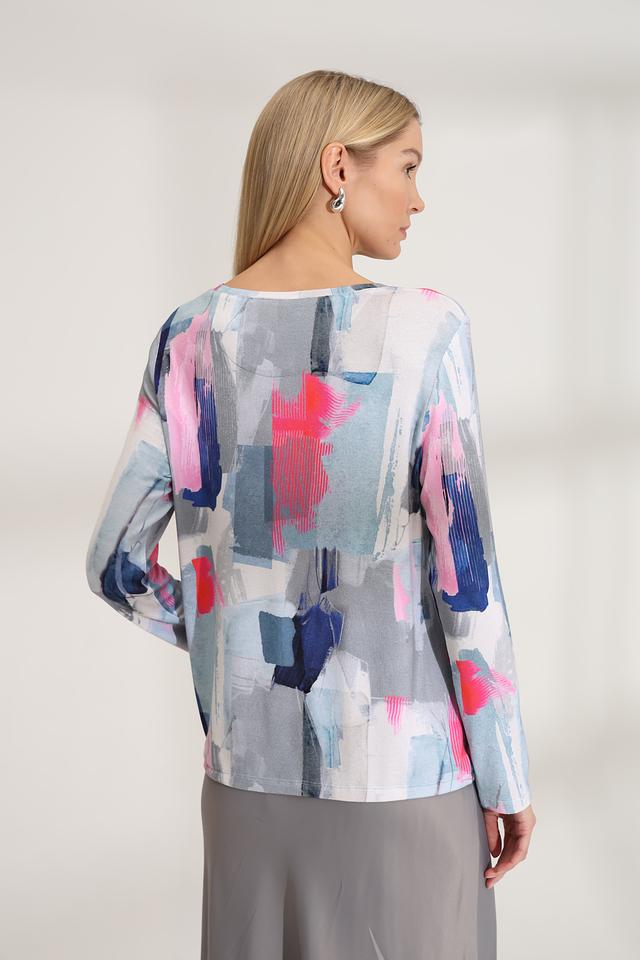 Особенностью модели является оригинальный абстрактный принт, выполненный в сочетании синих, розовых и серых оттенков. Этот принт делает пуловер уникальным и привлекательным. Состав: 95% вискоза, 5% эластан.