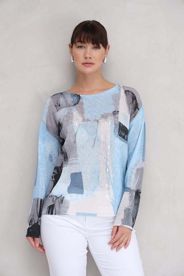 Женский пуловер Lecomte светло-голубого цвета с оригинальным абстрактным принтом. Изготовлен из мягкого и приятного к телу сочетания хлопка, льна и полиамида, обеспечивающего комфорт и долговечность. Состав: хлопок 61%, лен 21%, полиамид 18%