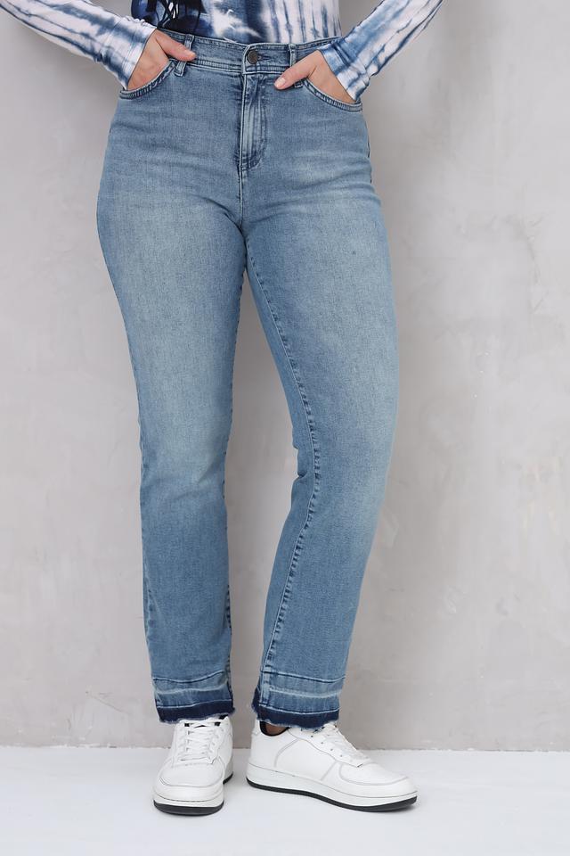 Джинсы имеют прямой крой, который обеспечивает комфортную посадку по фигуре. Особенностью модели является необработанный край штанин, придающий образу непринужденность и современный вид. Высокая посадка подчеркивает талию и визуально удлиняет ноги.