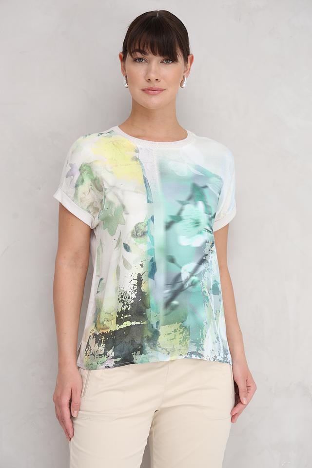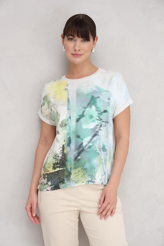 Блуза имеет свободный крой и короткие рукава с небольшими манжетами. Основной цвет блузы – светло-зелёный, но её украшает яркий и необычный абстрактный принт, выполненный в различных оттенках зелёного, жёлтого и белого.
