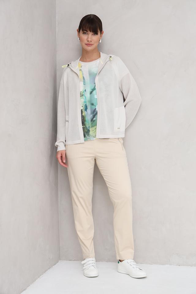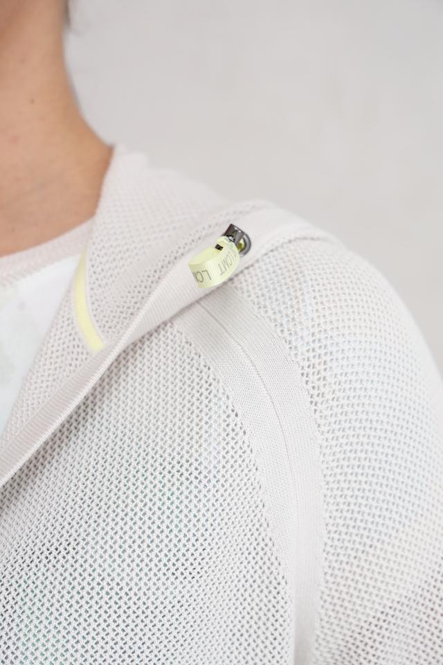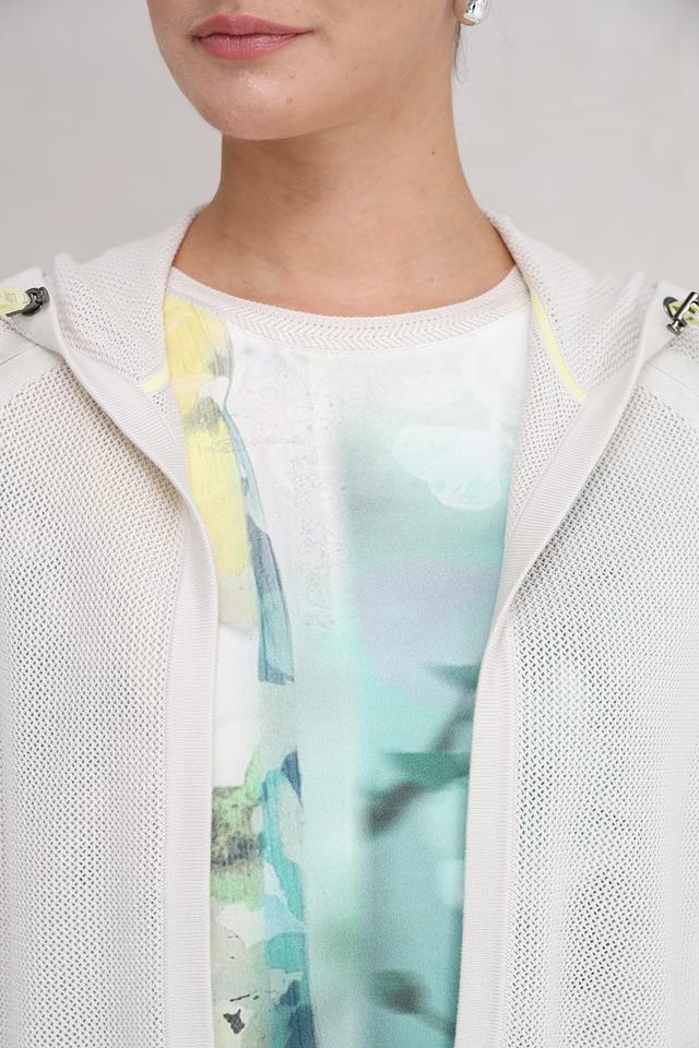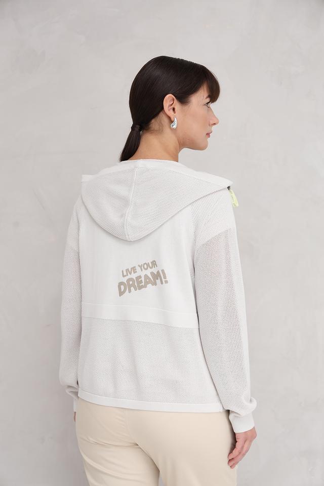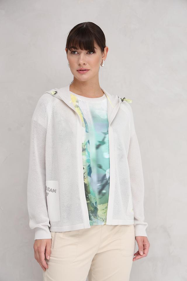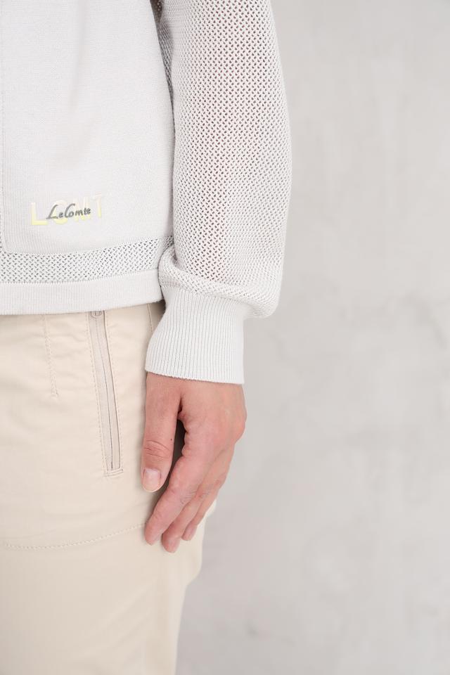 Этот жакет от Lecomte выполнен в светло-сером цвете и имеет оригинальную сетчатую текстуру. Модель с капюшоном и застежкой-молнией, что делает ее практичной и удобной в носке.