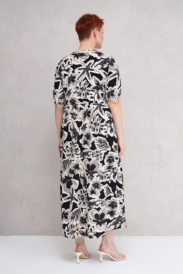 Это платье от Lecomte станет прекрасным дополнением к вашему гардеробу. Выполнено в чёрно-белой цветовой гамме с эффектным цветочным принтом, которое придает образу свежесть и женственность.
