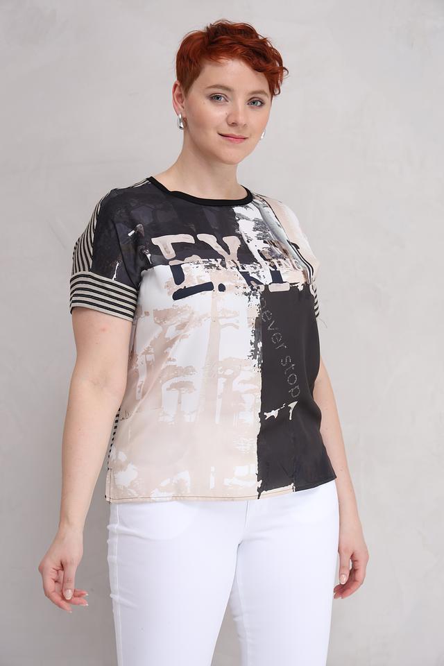 Модель имеет прямой крой, короткие рукава и круглый вырез горловины. Футболка изготовлена из сочетания вискозы (58%) и полиэстера (42%), что обеспечивает приятные тактильные ощущения, хорошую посадку и лёгкость в уходе.