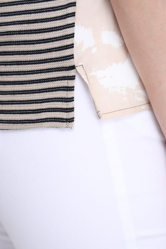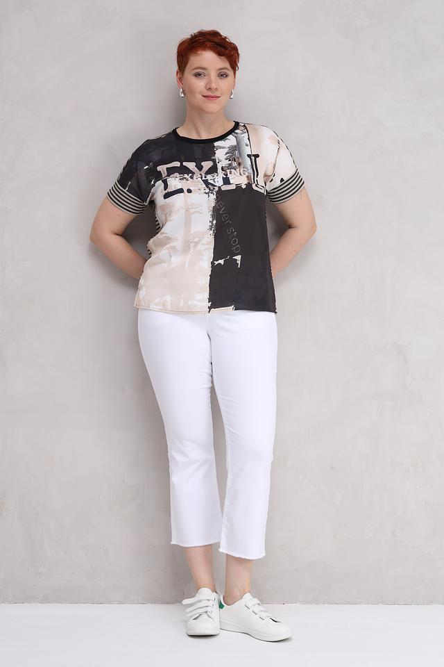 Рукава футболки декорированы полосками в тон. Благодаря своему универсальному дизайну, эта футболка легко сочетается с различными предметами одежды, такими как джинсы, юбки или шорты. Она идеально подходит для повседневной носки и создания стильных образов.