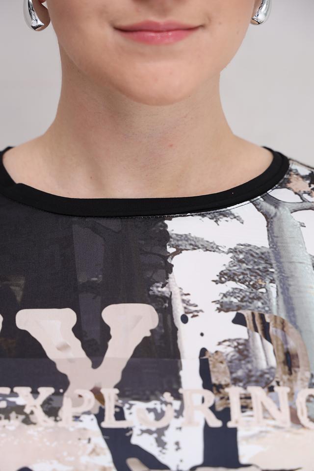 Женская футболка Lecomte чёрного цвета с оригинальным принтом и короткими рукавами. Изготовлена из мягкой вискозы и полиэстера, обеспечивающих комфорт и удобство в носке. Стильный и современный дизайн. Состав: вискоза 58%, полиэстер 42%