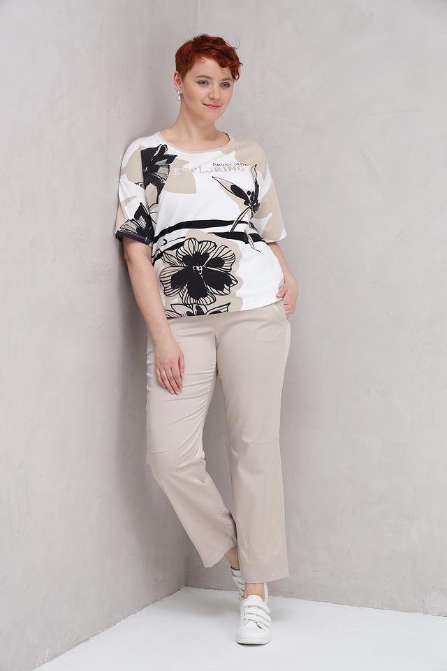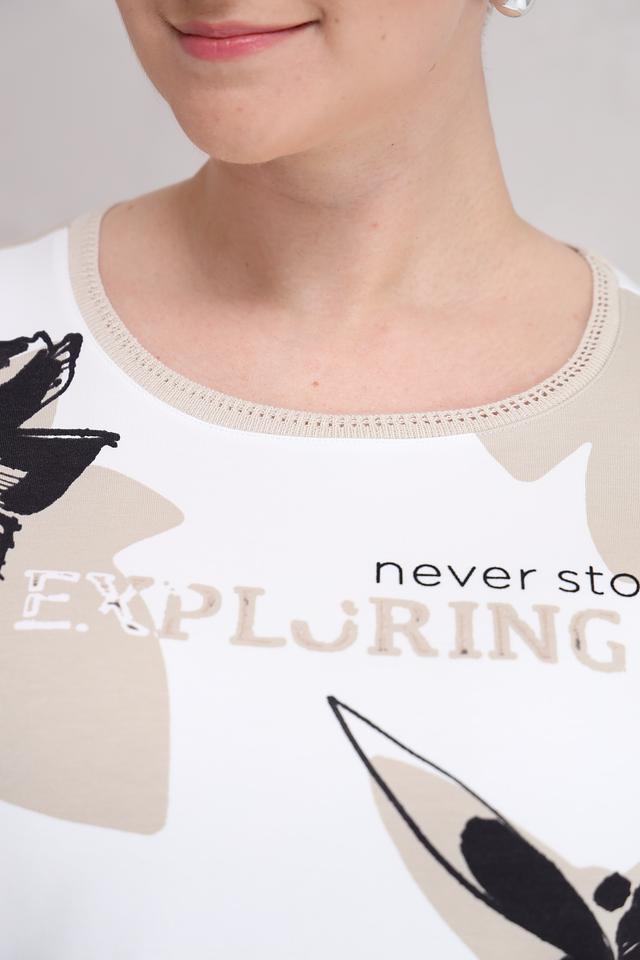 Женская футболка Lecomte белого цвета с ярким цветочным принтом и надписью "never stop exploring". Модель свободного кроя с короткими рукавами, выполнена из мягкого и приятного к телу сочетания хлопка, модала и эластана. Состав: хлопок 48%, модал 48%, эластан 4%