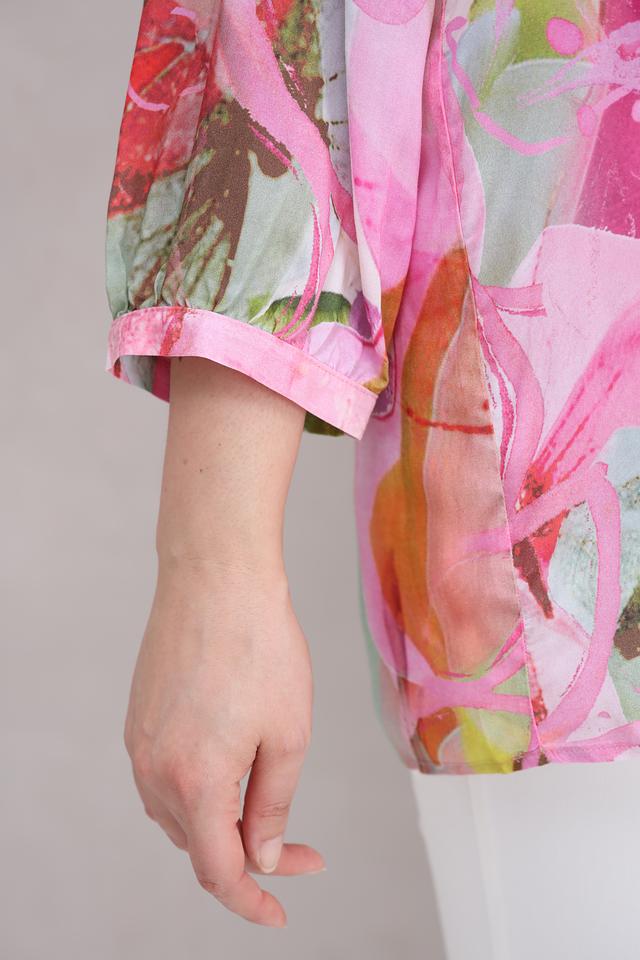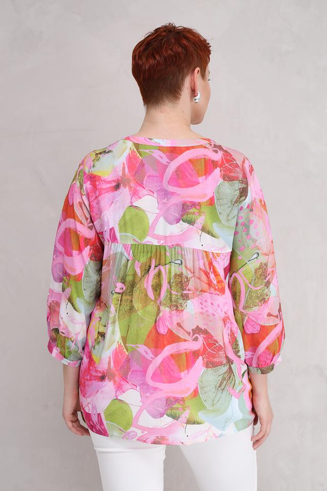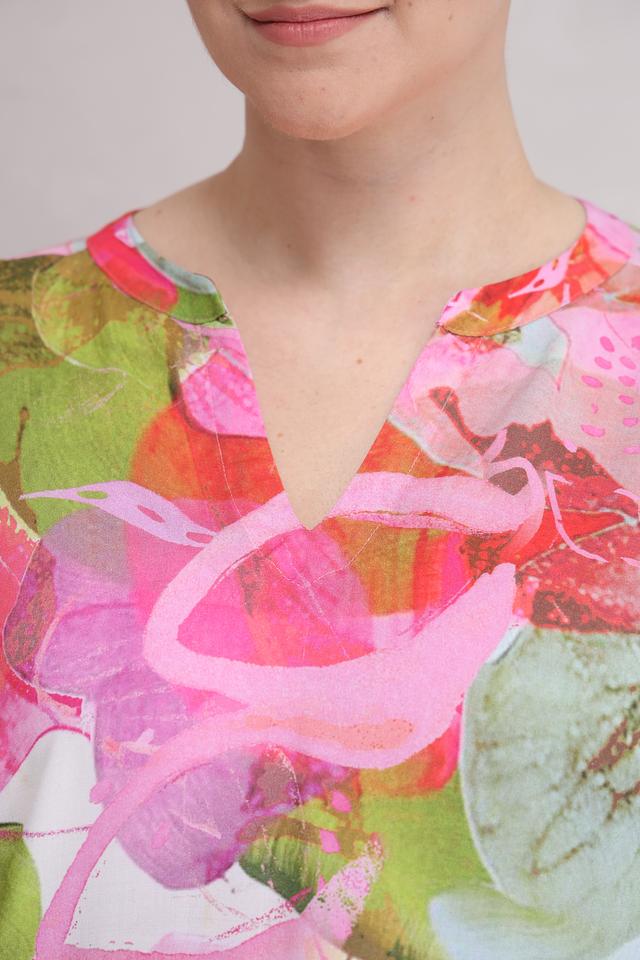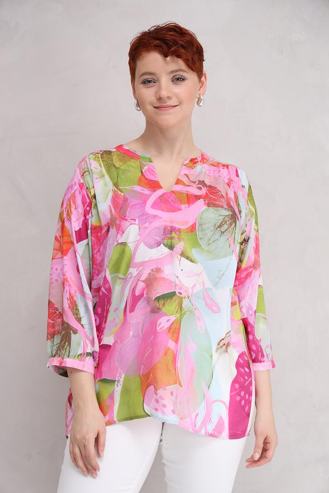 Яркий цветочный принт делает эту блузу уникальной и привлекательной. Она идеально подходит для создания как повседневных, так и праздничных образов. Блузу можно сочетать с брюками, юбками или джинсами.