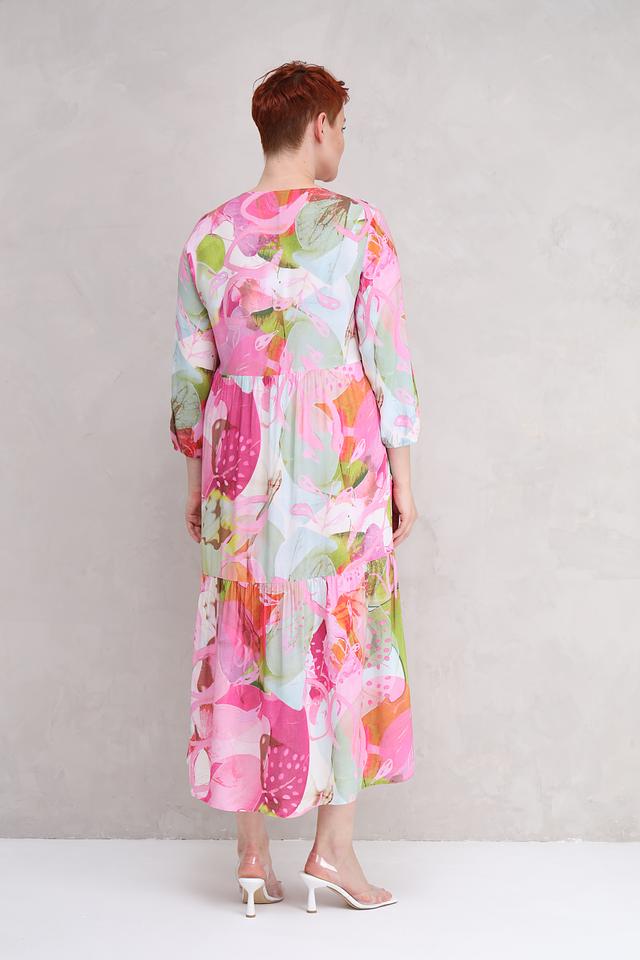 Модель отличается ярким цветочным принтом, который придает ей неповторимый вид. Платье имеет V-образный вырез, короткие рукава и многослойную юбку, создающую лёгкий и воздушный силуэт.