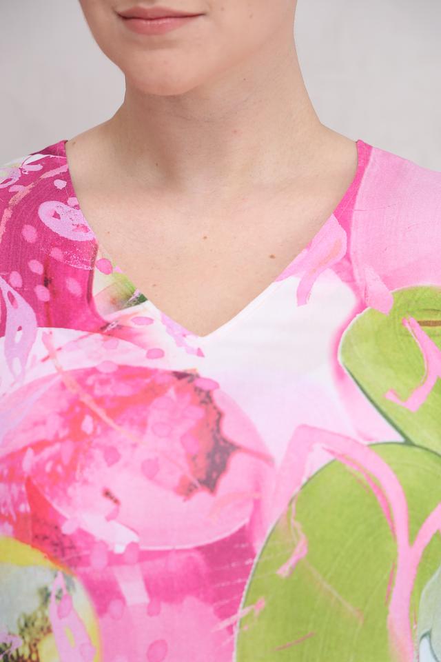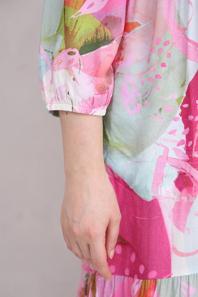 Платье Lecomte с ярким цветочным принтом выполнено из 100% вискозы, обеспечивая комфорт и лёгкость. Модель имеет V-образный вырез, рукава 3/4 и многослойную юбку. Состав: вискоза 100%