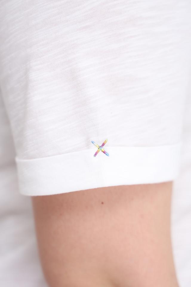 Футболка имеет прямой крой, короткие рукава и круглый вырез горловины. Ткань состоит из 50% хлопка и 50% модала, что обеспечивает мягкость, комфорт и хорошую воздухопроницаемость.