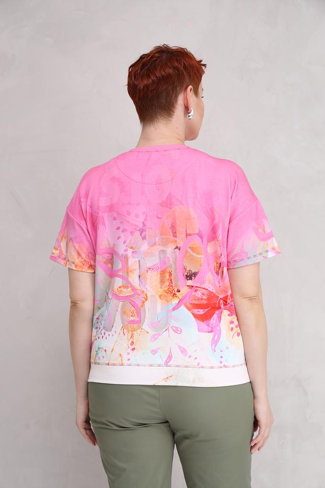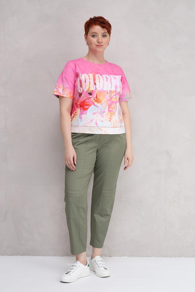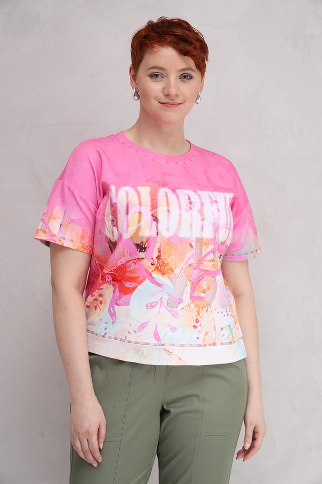 Женская футболка Lecomte розового цвета с ярким цветочным принтом и надписью "Colorful". Модель выполнена из мягкого и приятного к телу сочетания хлопка, модала и эластана, обеспечивающего комфорт при носке. Состав: хлопок 48%, модал 48%, эластан 4%