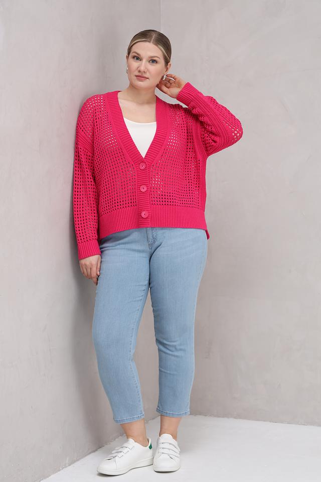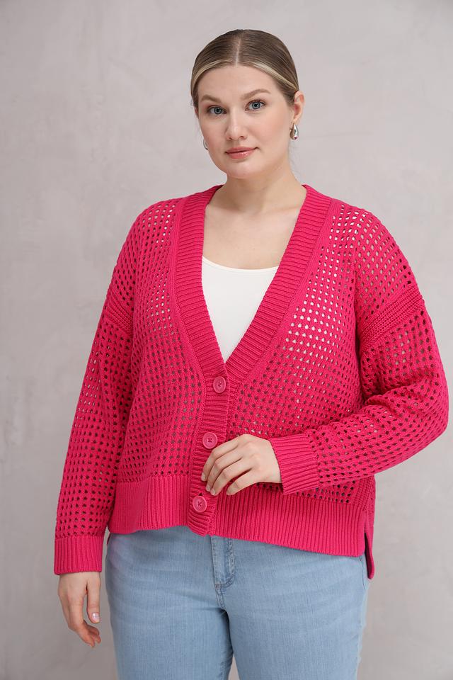 Малиновый жакет от Lecomte – это стильное и комфортное решение для создания модных образов. Ажурная вязка придает модели легкость и оригинальность, а удобный V-образный вырез и застежка на пуговицы обеспечивают комфортную посадку. Состав: хлопок 78%, полиэстер 22%