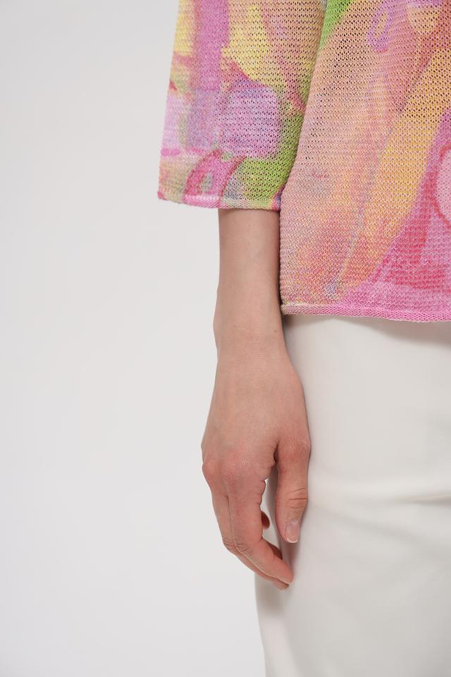 Пуловер имеет свободный крой, который не сковывает движений и обеспечивает максимальный комфорт. Вырез горловины – округлый, а рукава – три четверти. Текстура трикотажа легкая и приятная на ощупь.
