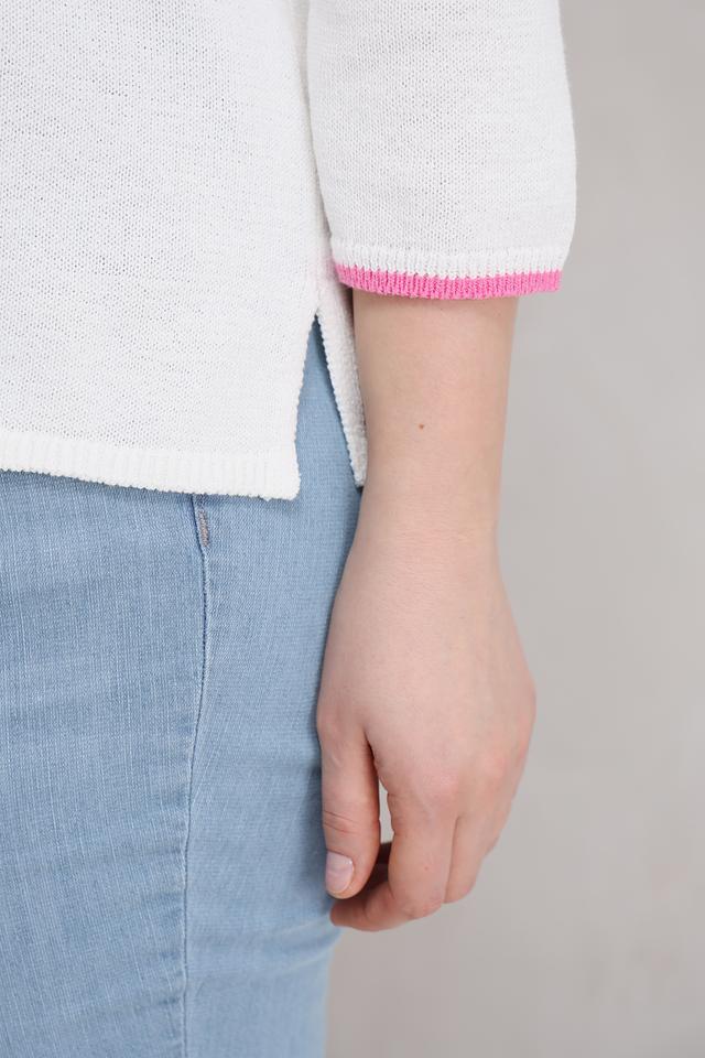 Нежная вязка и аккуратная обработка краев подчеркивают высокое качество изделия. Пуловер легко сочетается с джинсами, брюками или юбками, позволяя создавать разнообразные стильные образы. Розовая окантовка по низу изделия добавляет изюминку.