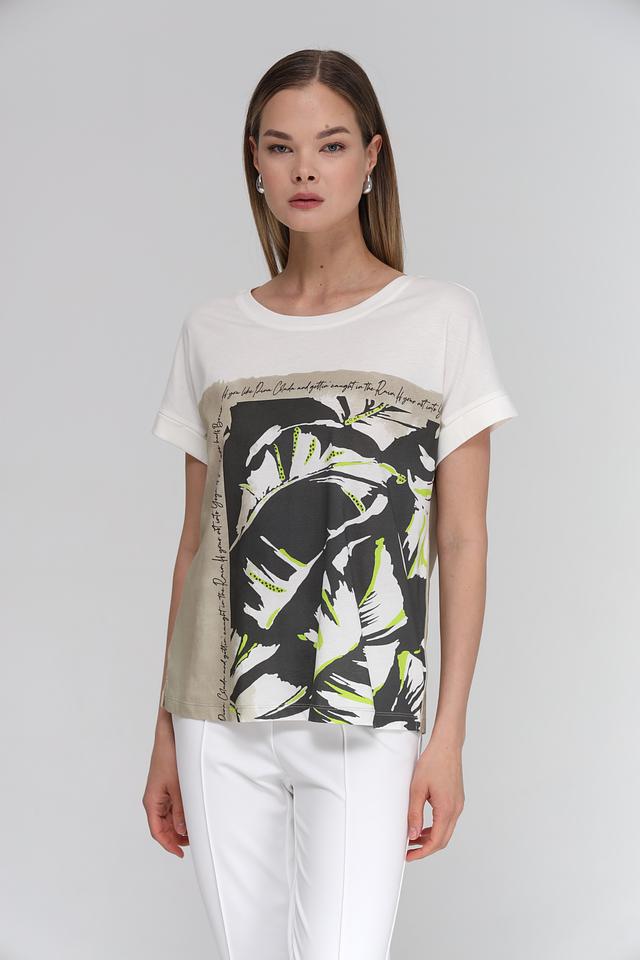 Фасон футболки – свободный, с короткими рукавами и округлым вырезом горловины. Такая модель отлично подойдет для создания повседневных образов. Футболка идеально сочетается с белыми брюками, джинсами или шортами.