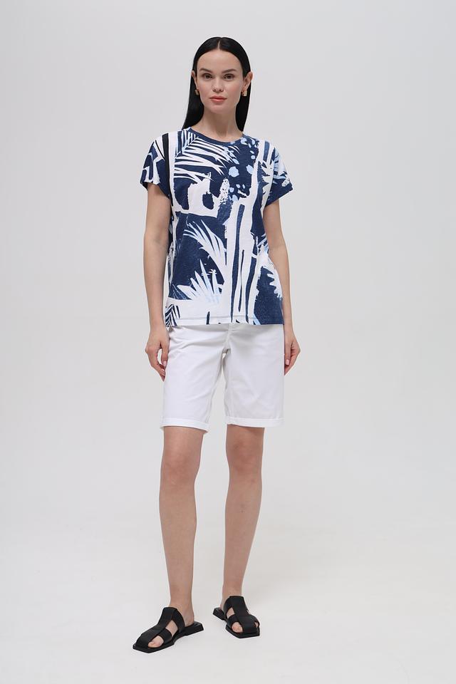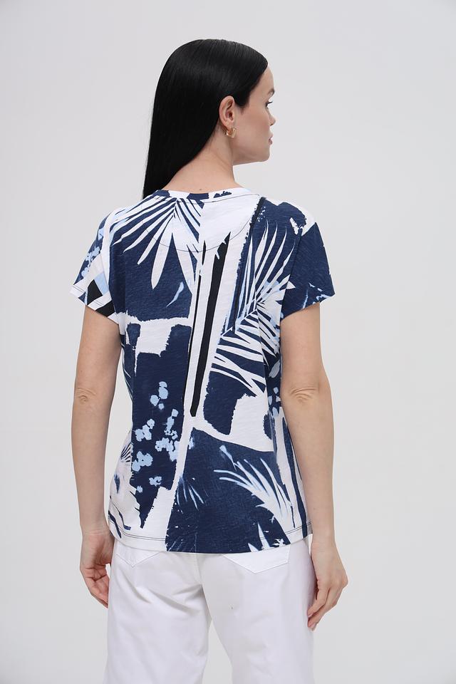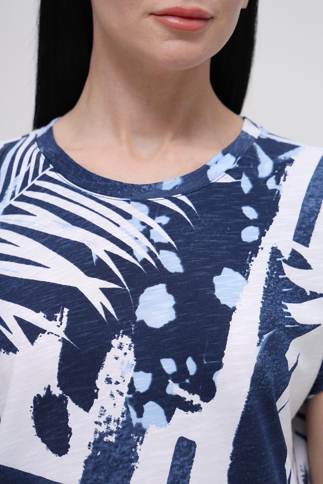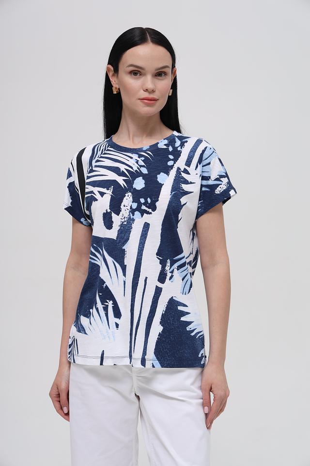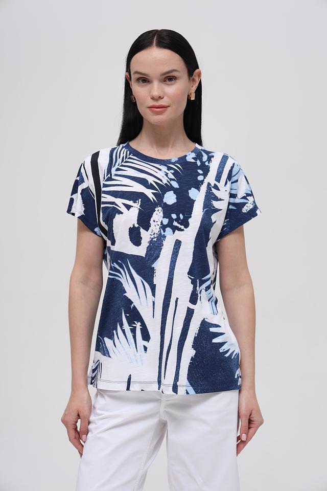 Женская футболка Lecomte синего цвета с ярким тропическим принтом станет отличным дополнением к летнему гардеробу. Изготовлена из мягкого и приятного к телу сочетания хлопка и модала, обеспечивая комфорт в жаркую погоду. Состав: хлопок 50%, модал 50%