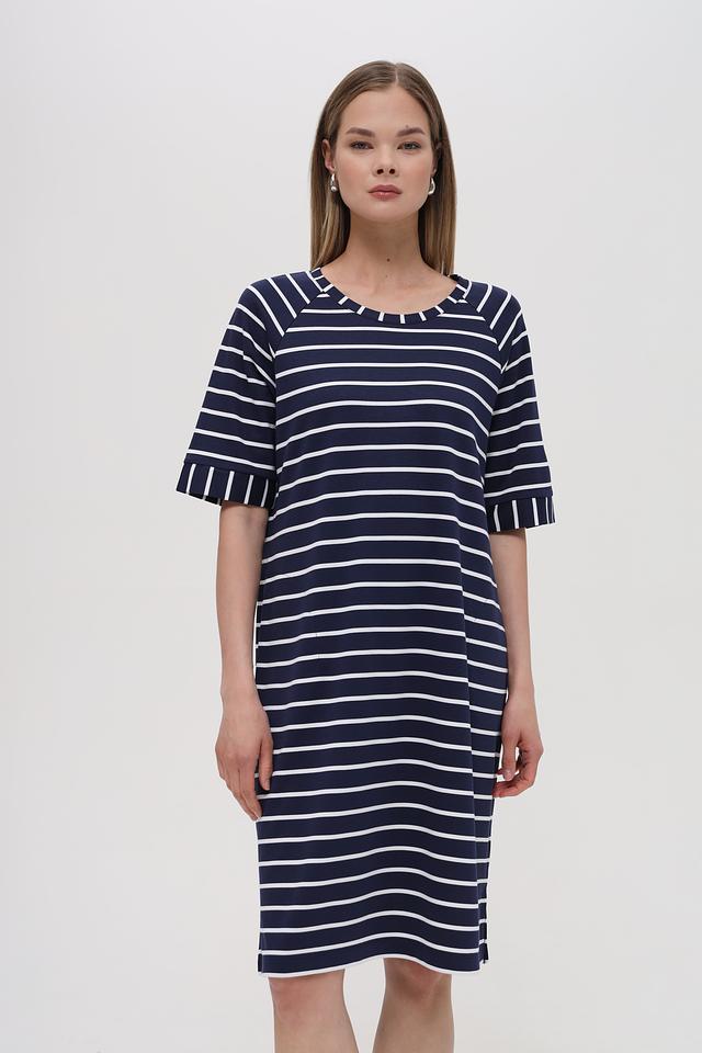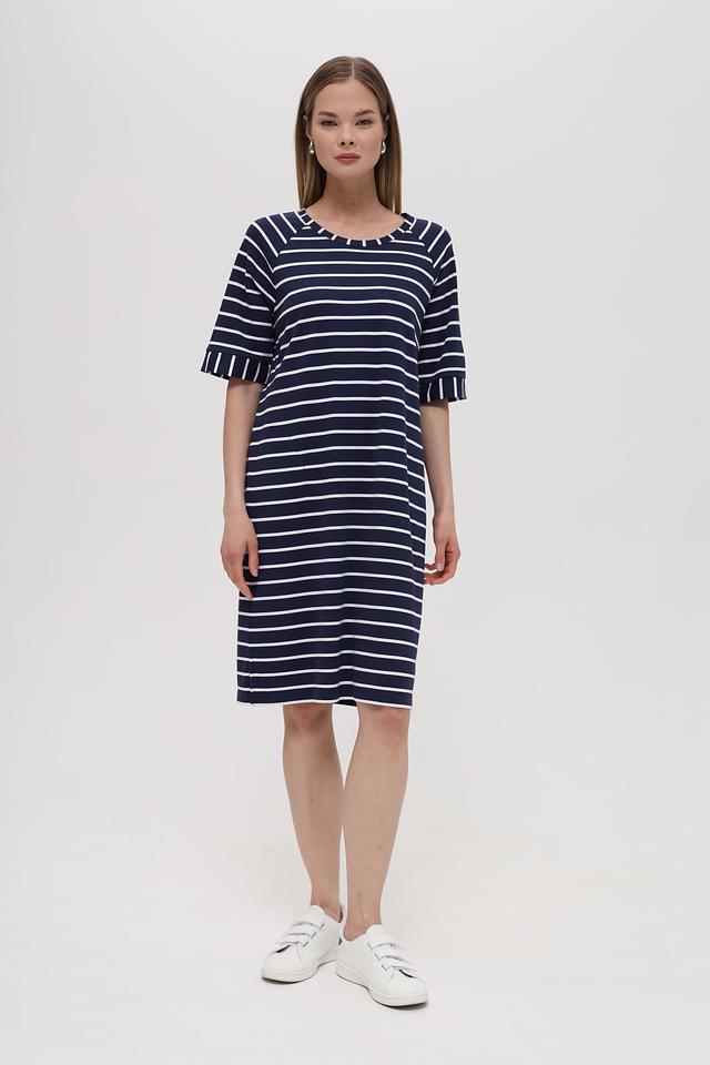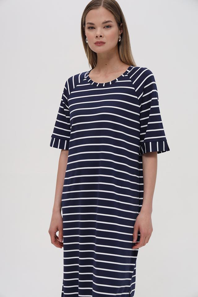 Платье Lecomte синего цвета с белой полоской – это стильное и комфортное решение для повседневного гардероба. Модель имеет прямой силуэт и короткий рукав с небольшим воланом, что придает ей особый шарм. Состав: вискоза 72%, полиэстер 23%, эластан 5%